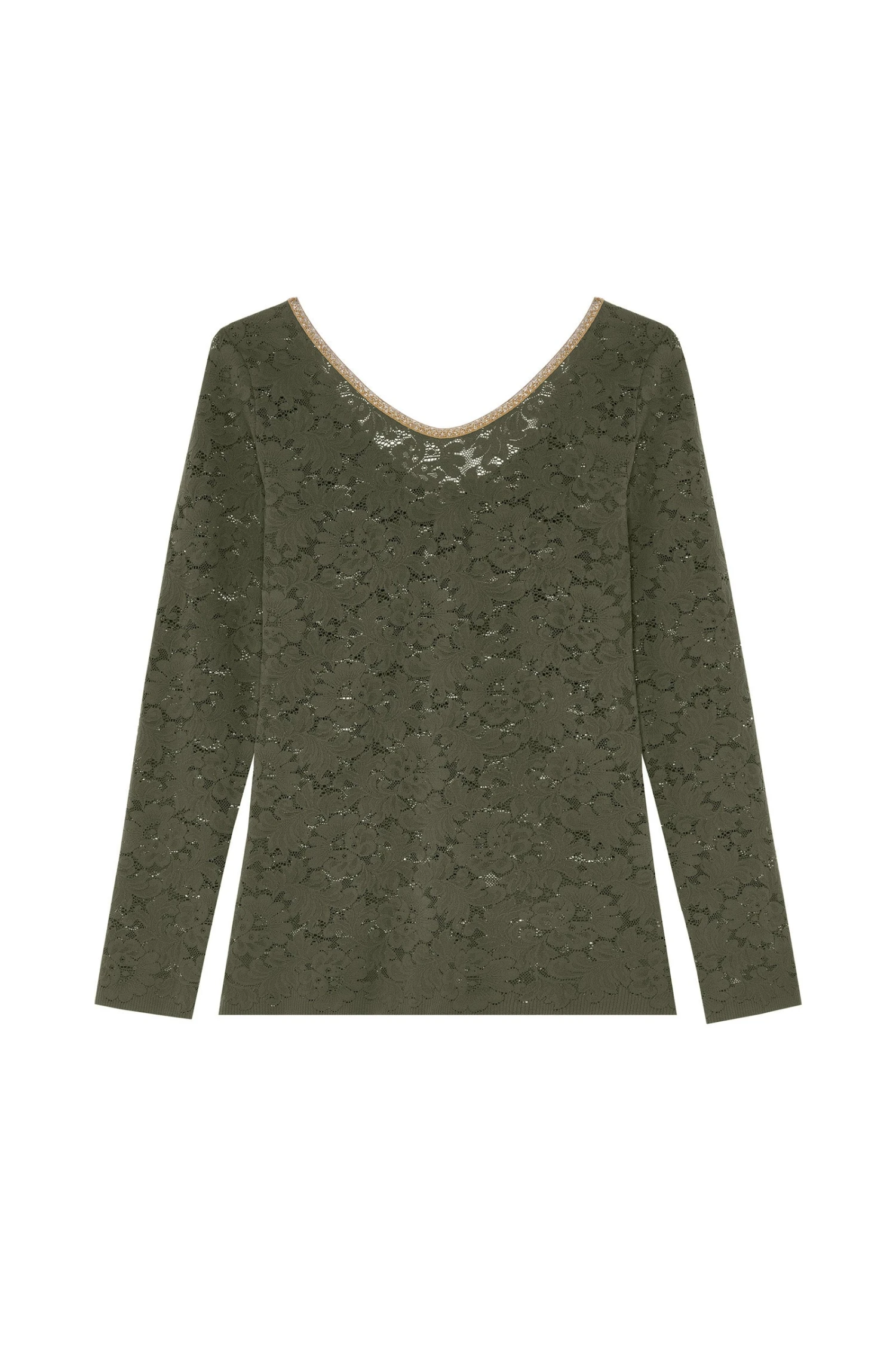 Top manches longues, décolleté dans le dos, élastique plié doré en finition. Dentelle française.