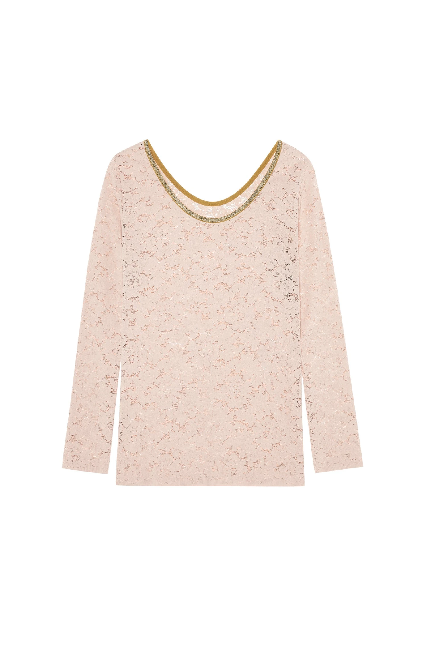 Top manches longues, décolleté dans le dos, élastique plié doré en finition. Dentelle française.
