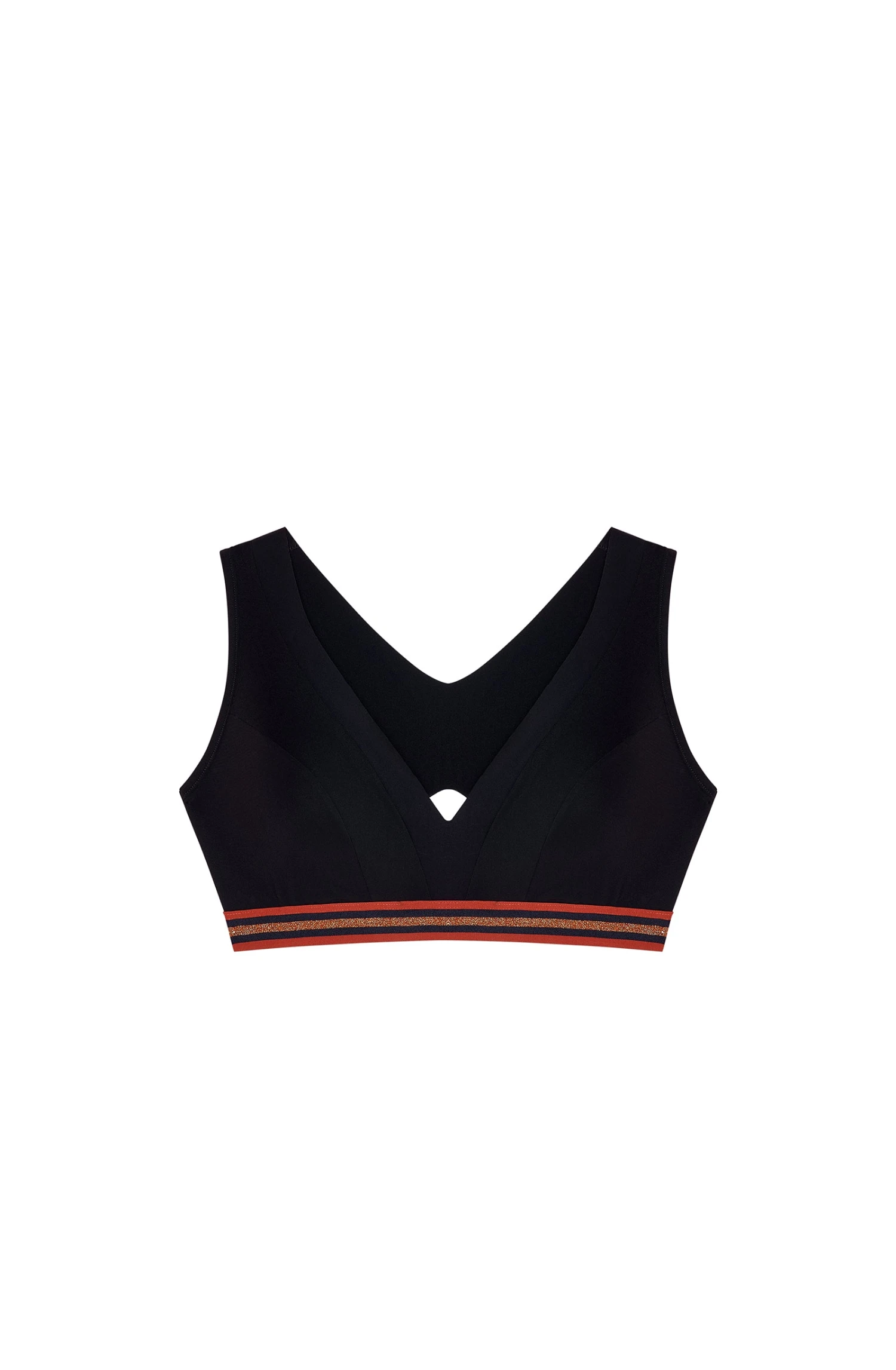 Soutien-gorge brassière entièrement doublé pour un meilleur maintien. Découpe sur les bonnets avec coques amovibles. Encolure et dos en Bonded à bords francs. Élastique rayé sous-poitrine de 3 cm.