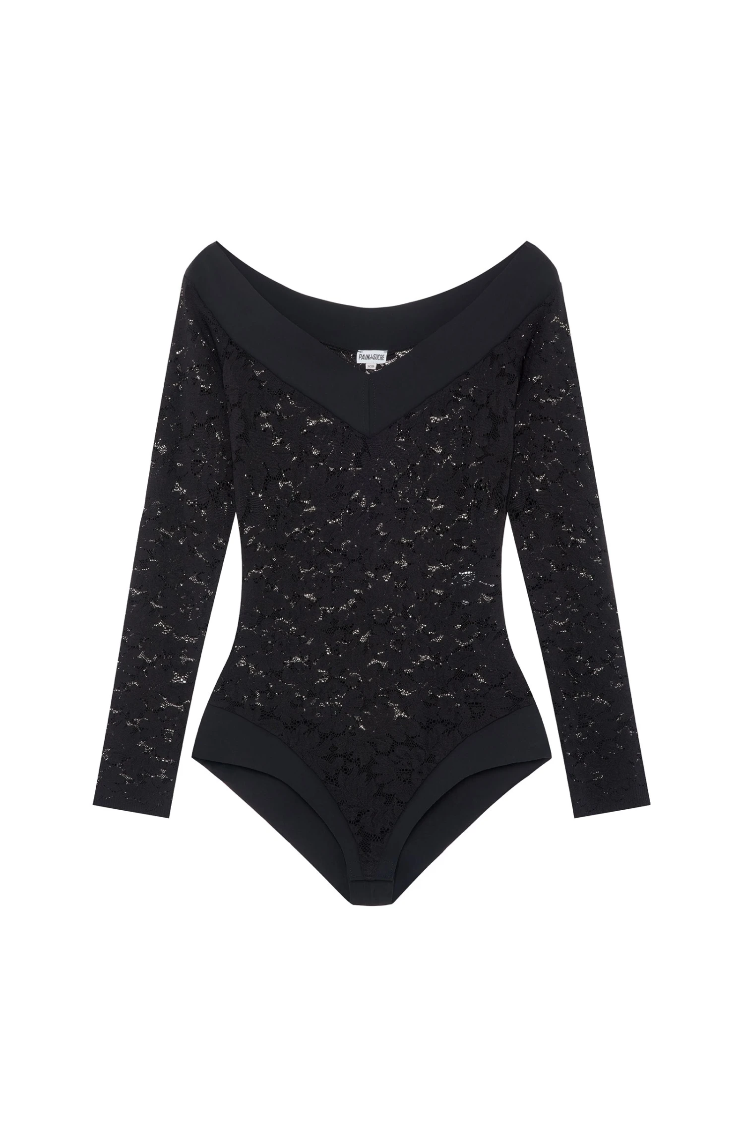 Entre charme et sensualité, les matières se mêlent dans un équilibre parfait. Le body noir BINGO dévoile sa délicate dentelle et pare sa large encolure bateau d’une bande en bonded pour sublimer avec grâce les atouts féminins.