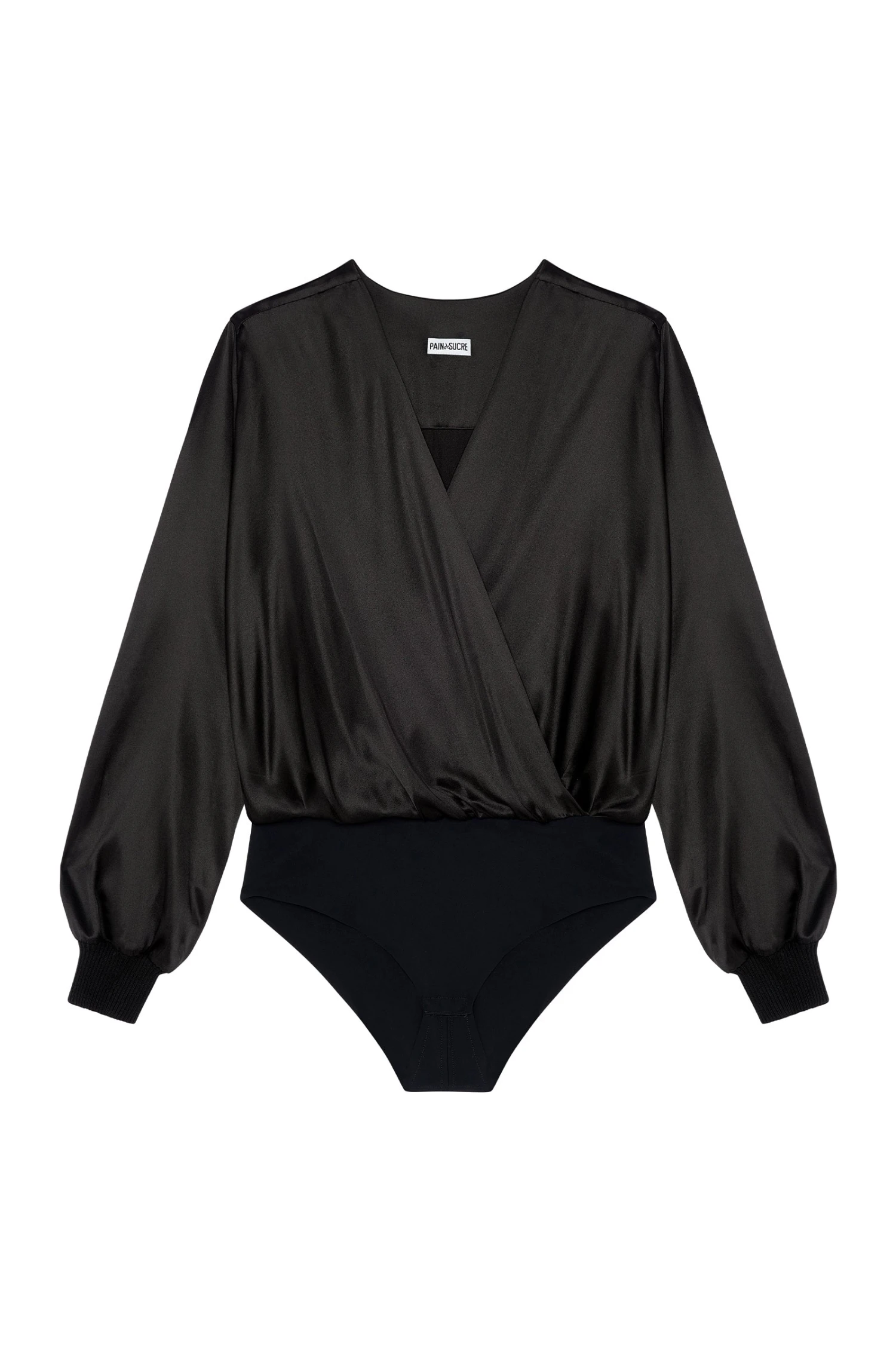 Body cache-coeur en soie, manches bishop, poignets en bord-côte noir, culotte en Bonded noir à bords francs.