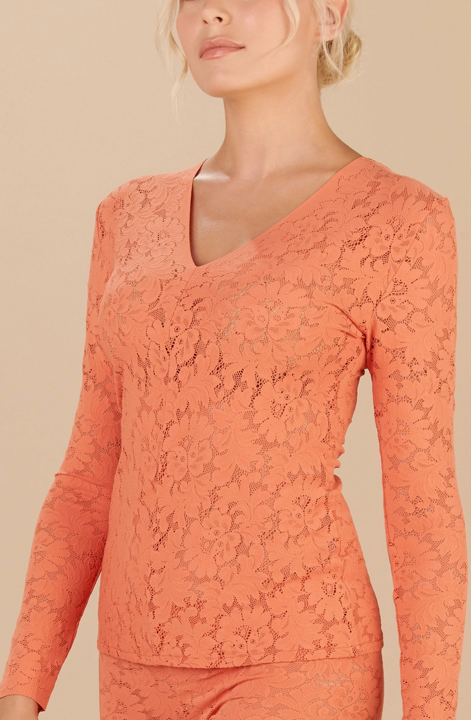 Top manches longues en dentelle, décolleté en V. Tissu dentelle française.