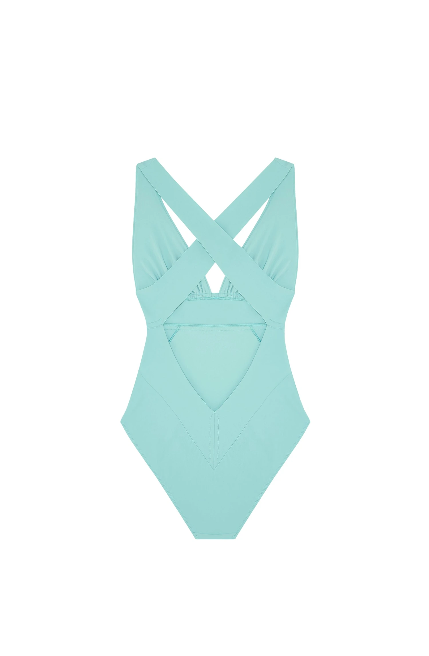 À la frontière entre le body et le maillot de bain, le une pièce CAPRI aqua est un nageur graphique signature de la maison PAIN DE SUCRE. Chic et intemporel, c’est un incontournable de votre dressing balnéaire ! Sa coupe aux lignes franches et ajustées dessine superbement nos formes. Il nous assure confort et maintien grâce au large empiècement sous poitrine gainant qui se prolonge en bretelles croisées dos. Avec ses profonds bonnets drapés, CAPRI convient à toutes les tailles et formes de poitrine. Côté dos, son échancrure en pointe unique sublime votre chute de reins tout en structurant vos hanches. Un look sportswear chic aux lignes pures et dynamiques qui élance la silhouette !