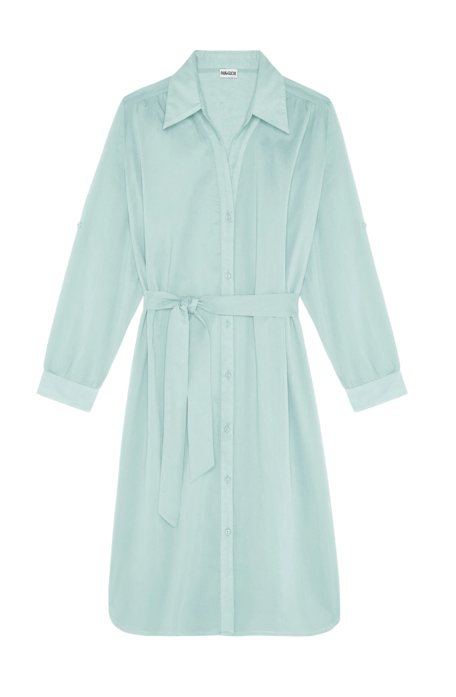 Robe-chemise droite, froncée aux épaules. Boutonnée sur toute la hauteur. Longues manches pouvant se retrousser, maintenues par une patte de boutonnage. Ceinture amovible assortie. Longueur dessus genoux.