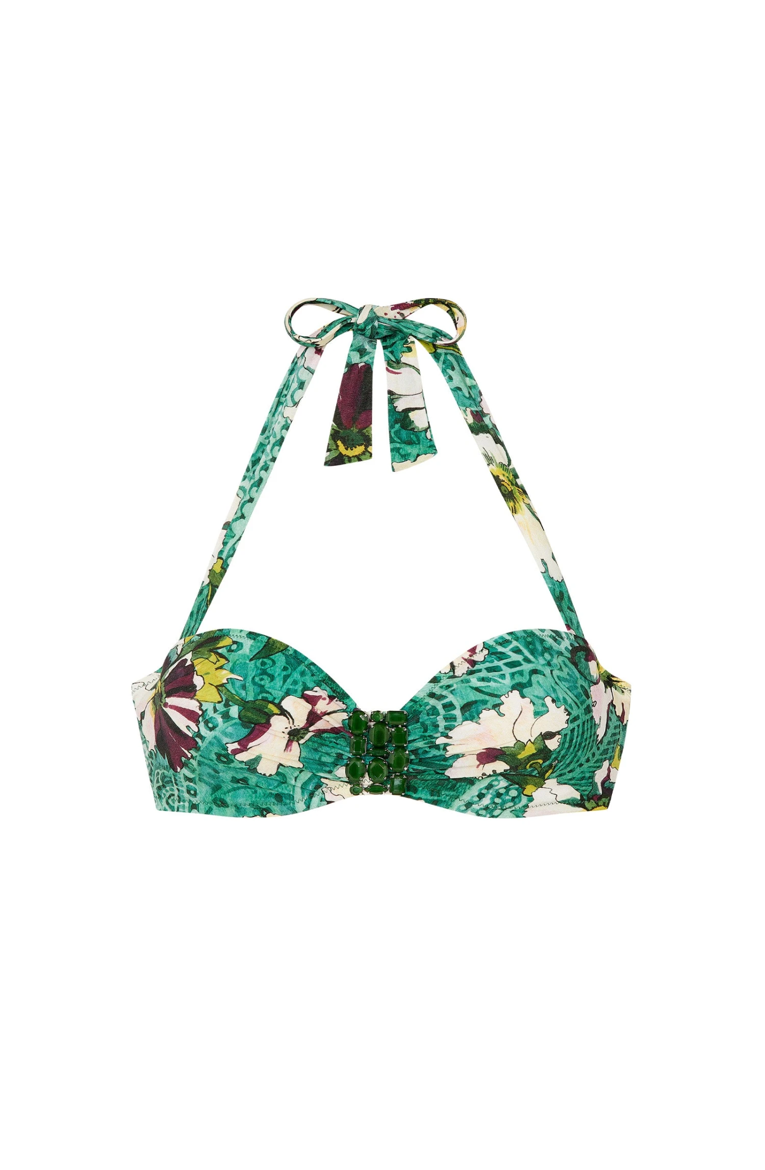 Le haut de maillot balconnet DALVA assure un maintien parfait grâce à ses différentes bretelles à nouer. Cette pièce couture dévoile des bijoux strass au centre de la poitrine qui magnifient et font rayonner le décollété. L’imprimé PRIMAVERA, véritable éclosion de pétales délicats au cœur du jardin de Monet.