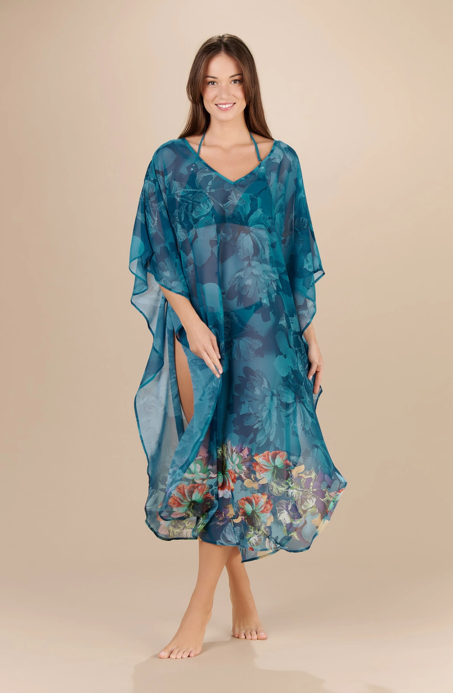 Long caftan ample en voile, fendu côtés. Grand décolleté V. Finition encolure biais. Finitions petit ourlet sur les manches et le bas. Motifs placés sur le bas du vêtement.