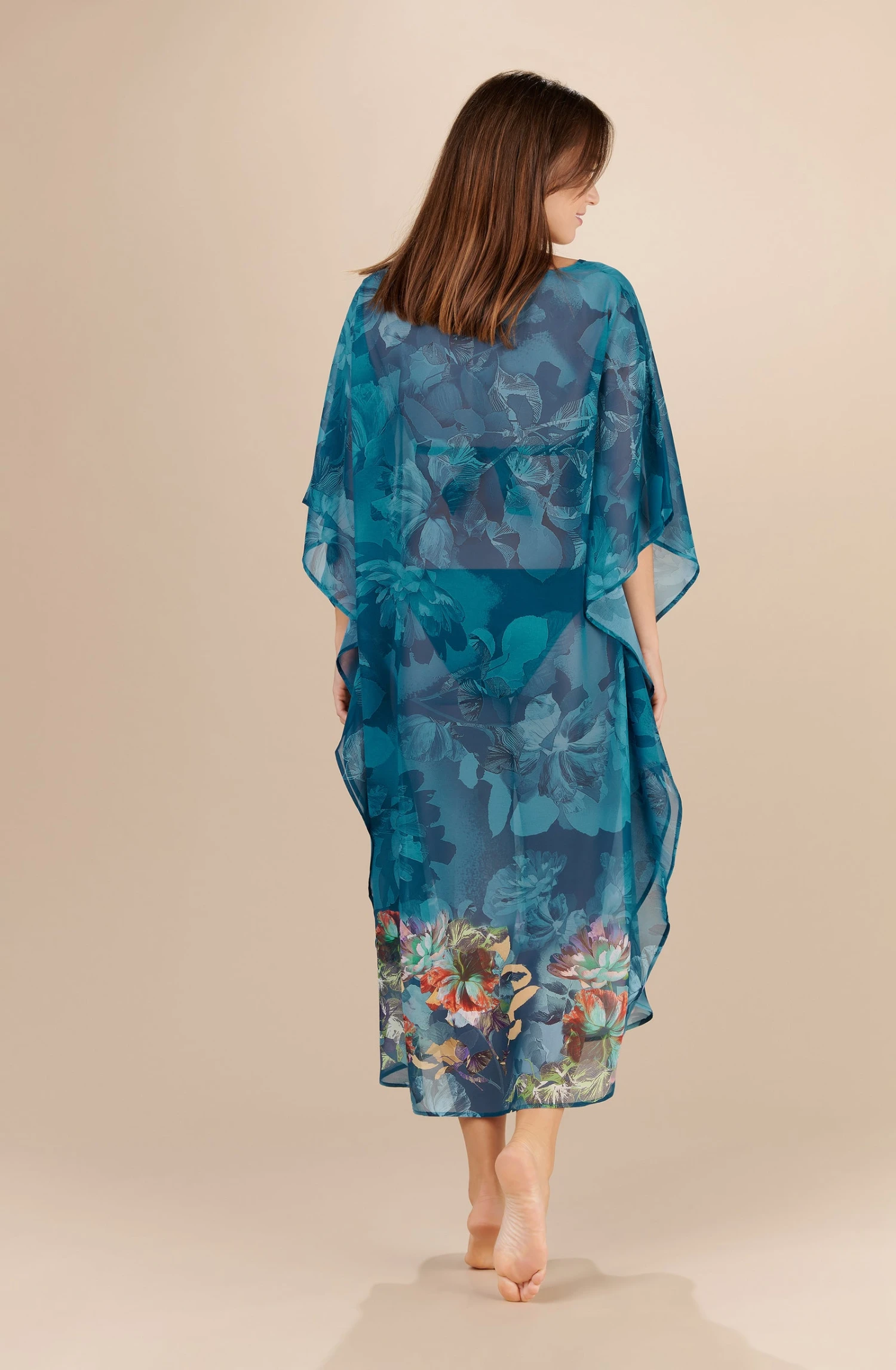Look bohème exotique avec notre long caftan ample DARLI. Son voile léger nous couvre avec grâce et élégance pour aller ou revenir de la plage. On l’enfile en un clin d’œil et on aime son encolure en V qui nous offre un profond décolleté. On est surtout envoûtée par son imprimé BLOSSOM. Il nous entoure et nous sublime sur des nuances profondes de bleu persan dévoilant subtilement ses motifs fleuris et ses reflets colorés sur le bas. Une invitation au voyage d’une infinie délicatesse. Pas de doute, ce caftan est la tenue de plage qu’on veut absolument cet été.
