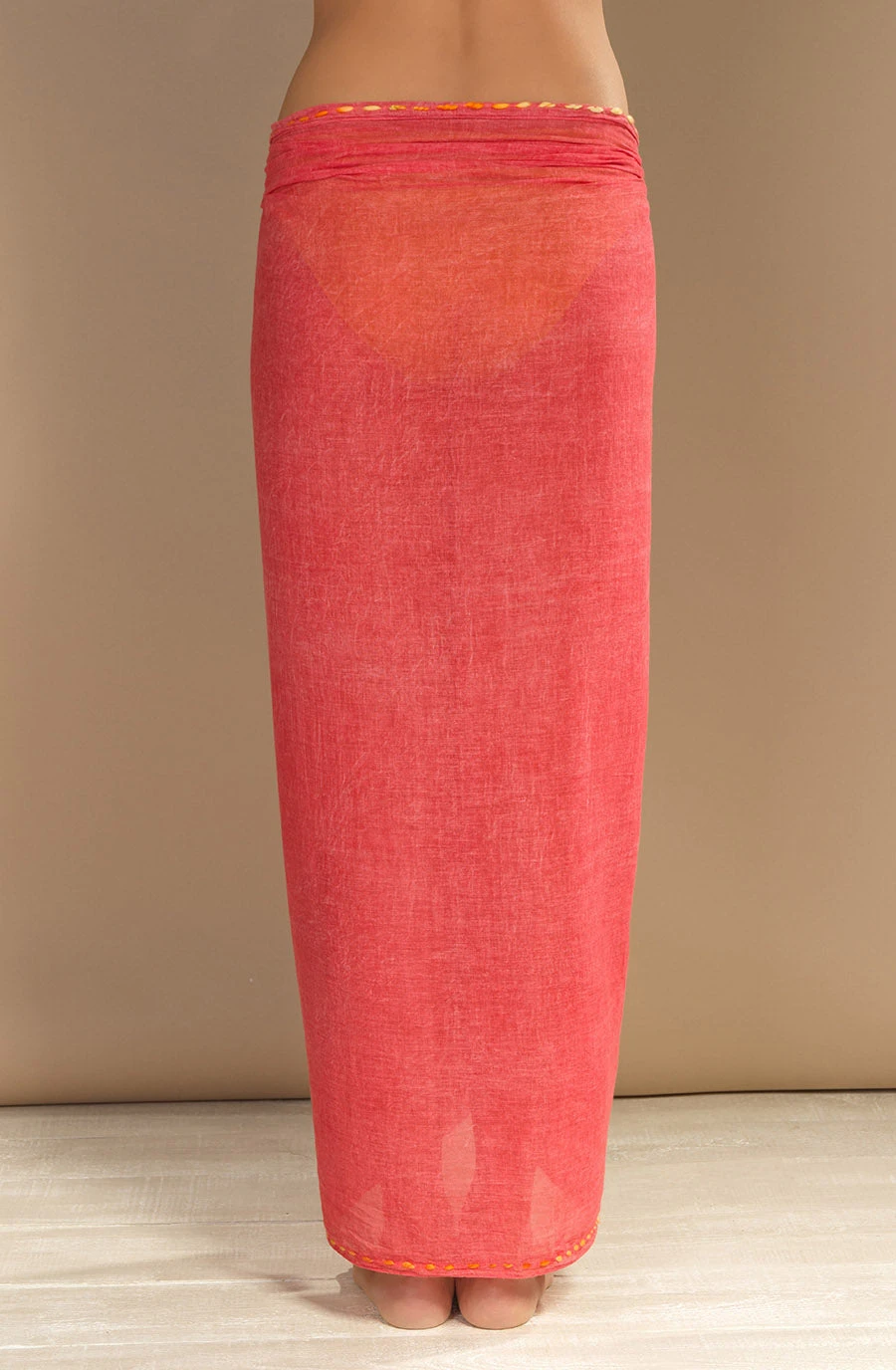Grand paréo red e 180 x 110 cm. Finition ourlet foulard. Bordures surfilées d’un fil acrylique multicolore.
