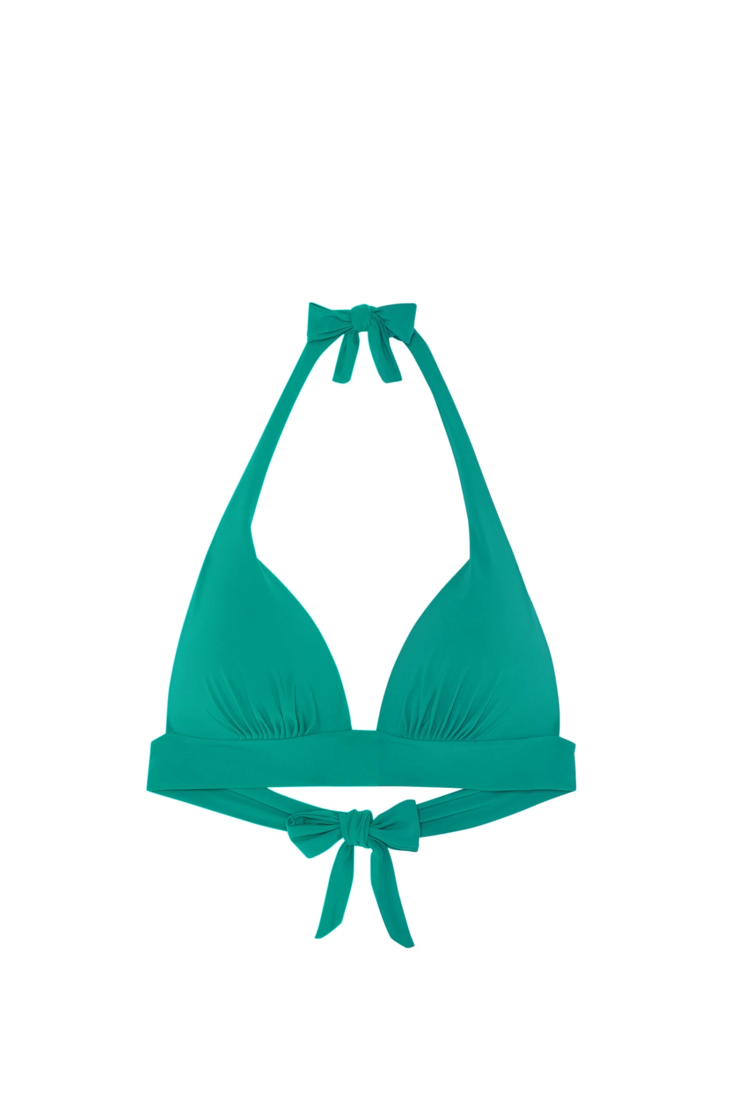 Haut de maillot de bain vert, coques push-up amovibles, froncé sous poitrine, larges bretelles nouées à la nuque.