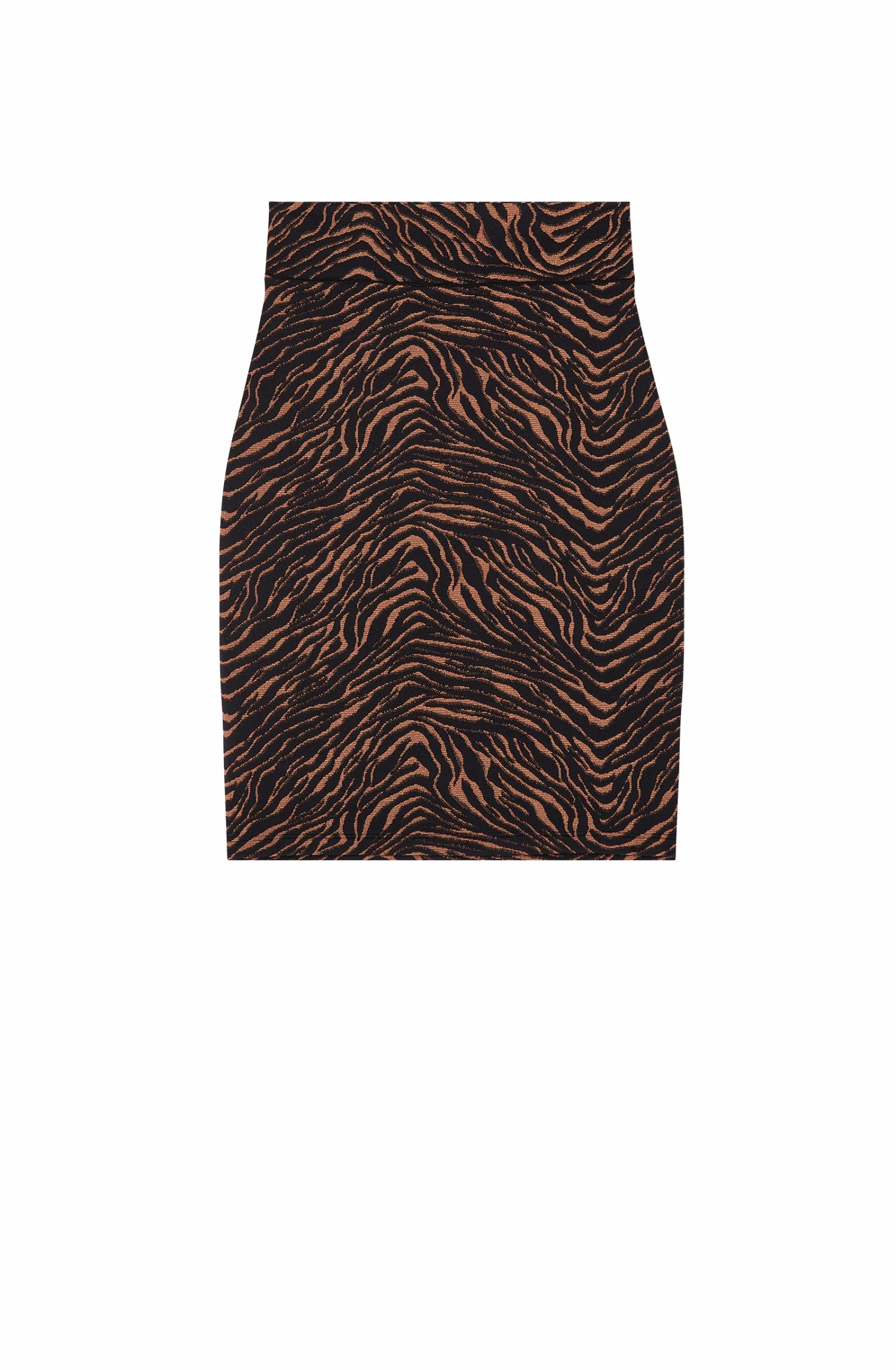 Jupe fourreau au-dessus du genou, ceinture à la taille doublée avec détail passepoil noir. Maille française à motif « Tigre » noire et cuivre légèrement brillante.
