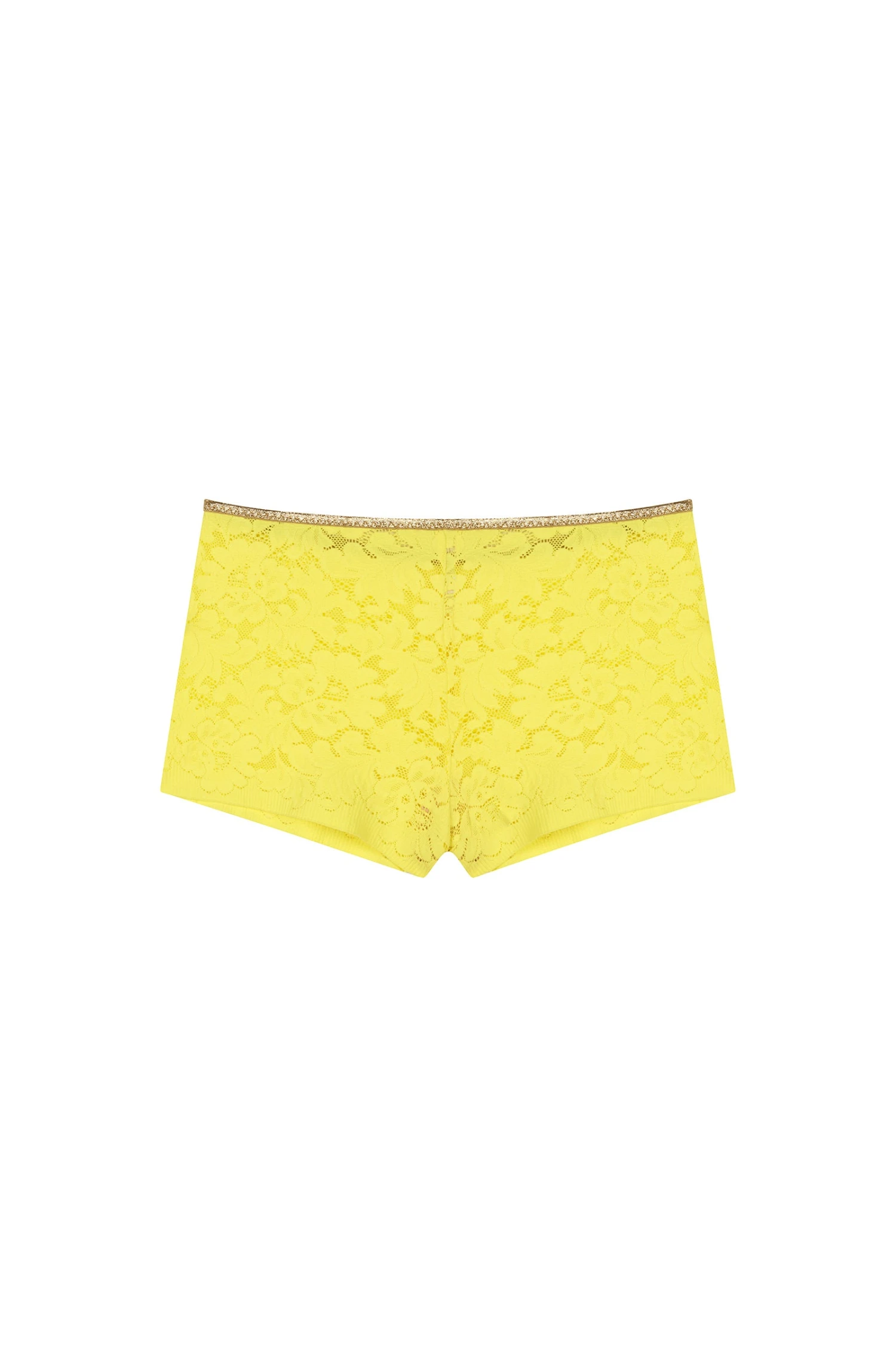 D’une douceur exquise, le shorty taille haute DYLAN épouse les formes en toute beauté. La taille est sublimée par la bordure en lurex doré et la délicate dentelle couleur jaune nous habille dans un jeu de transparence aussi subtil qu’élégant.