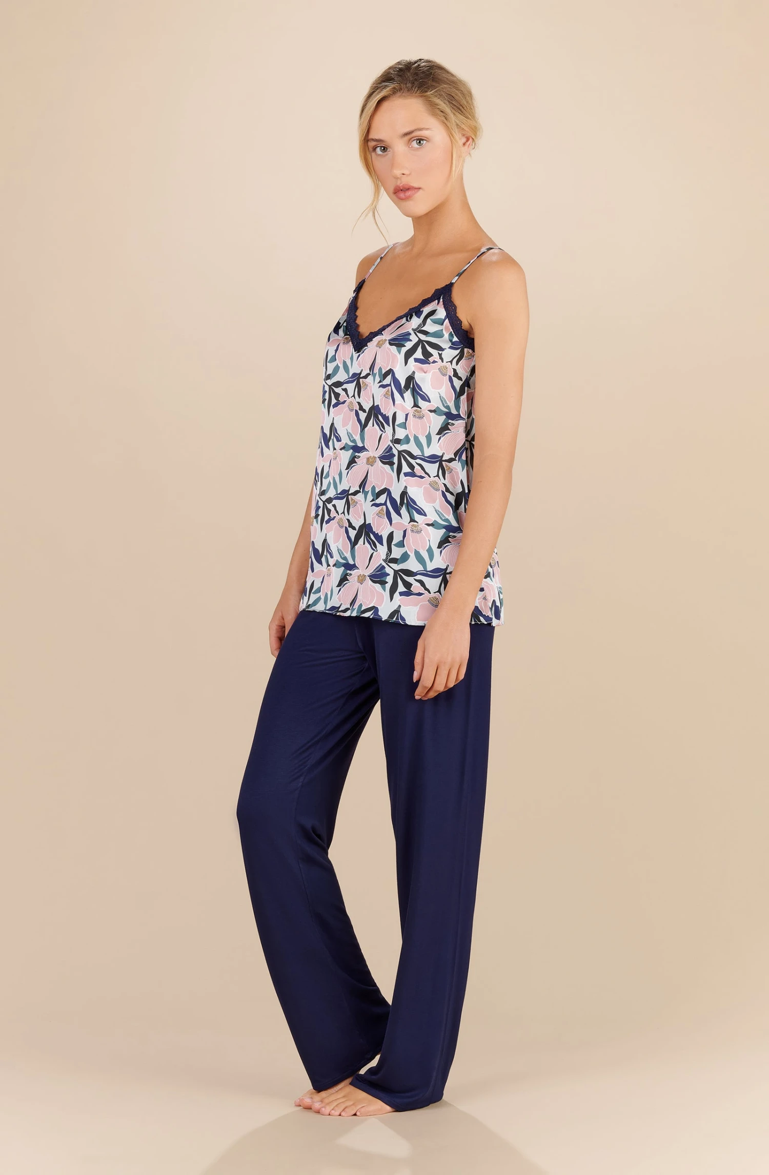 Caraco imprimé fleuri. Finition en dentelle marine. Fines bretelles ajustables avec régleurs dorés. Coutures anglaises intérieures, pinces poitrine. Matière en satin d’origine italienne, toucher soyeux.