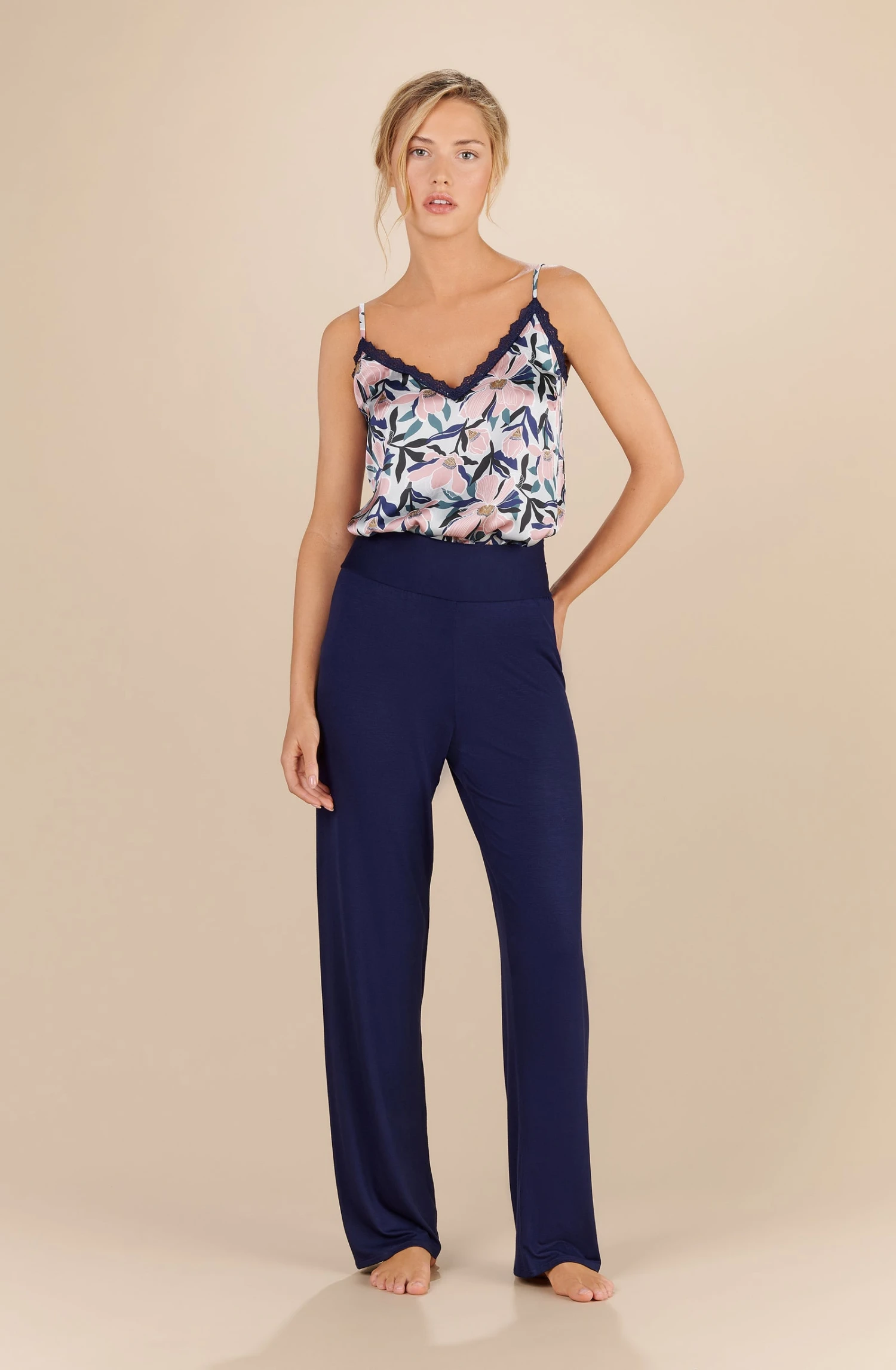 L’imprimé fleuri du caraco se retrouve sur un ensemble parfaitement coordonné avec le pantalon ample TOM et le kimono DELILA. Pour trancher et se parer de soie italienne, le même ensemble, TOM et DELILA, se combine au top ELFY sur des nuances délicates poudrées. Enfin, le pantalon PRADY en viscose marine est une alternative particulièrement confortable.