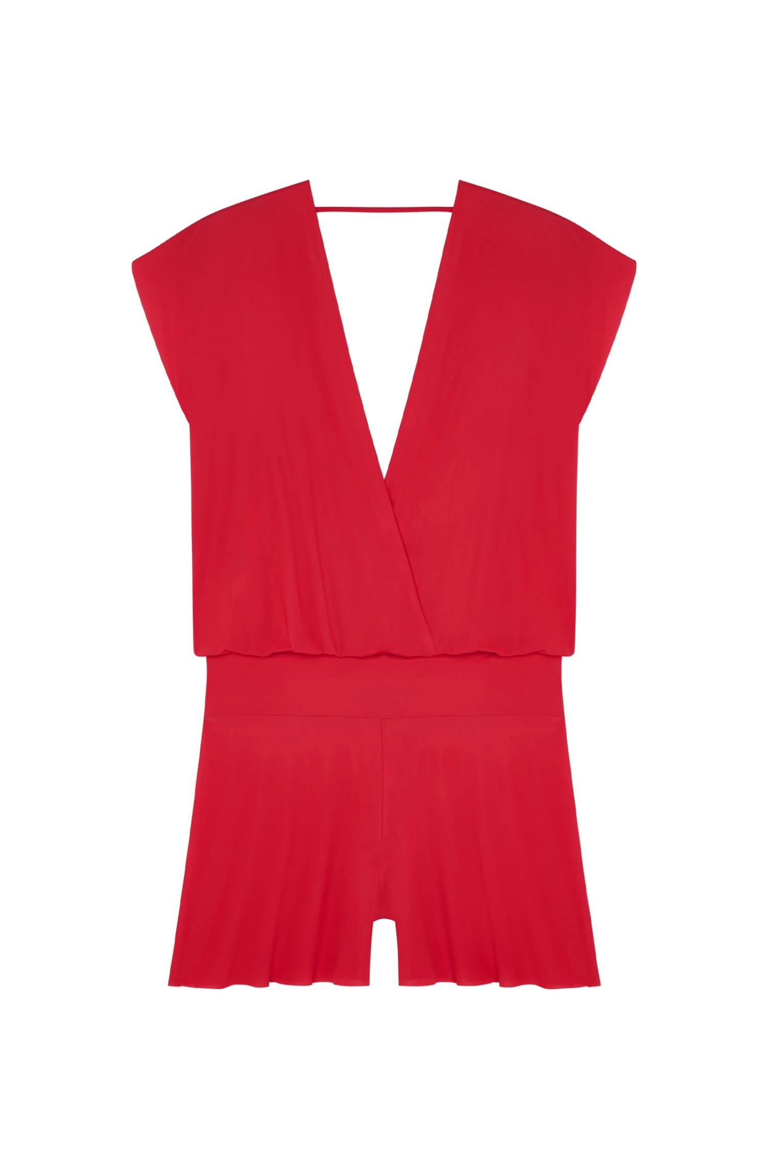 Combi-short ample en voile léger. Petites manches. Taille large montée en fourreau. Profond décolleté croisé devant et grand décolleté dos en V. Lien de maintien à la nuque. Finitions découpe free-cut.