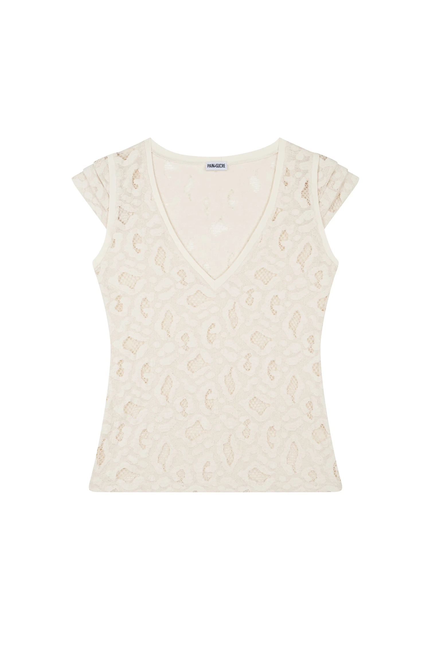 Top manches courtes en dentelle. Décolleté en V. Finition décolleté et emmanchures en Bonded.