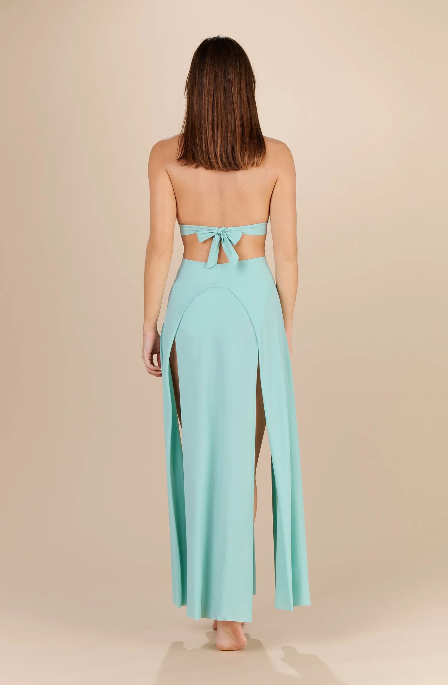 La jupe fendue JAX revisite les codes de la classique jupe longue évasée. Ouverte par quatre pans, son voile léger dévoile les jambes au rythme des mouvements. Aérienne, cette pièce habille avec caractère une tenue de plage.