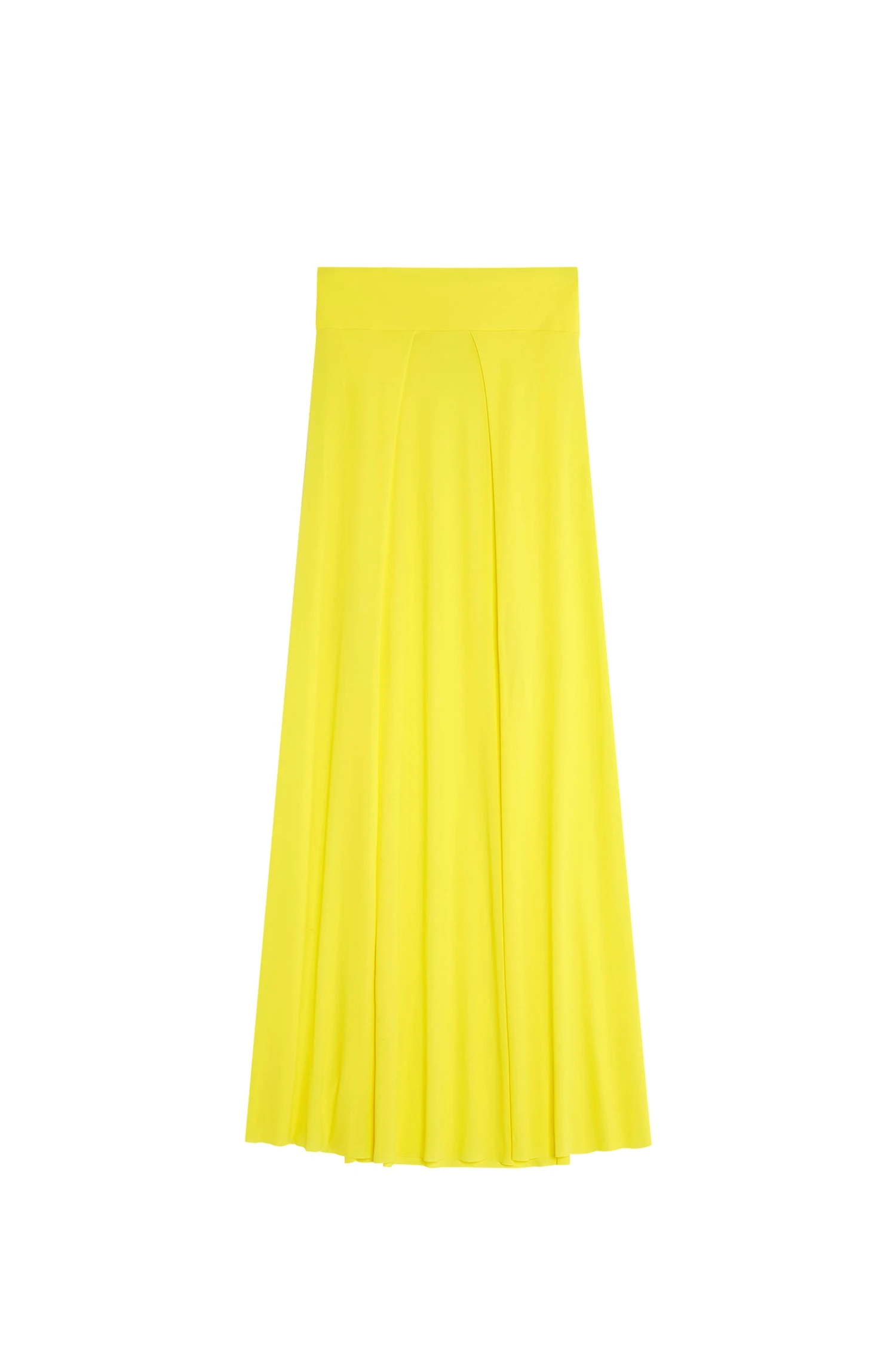 Jupe longue évasée fendue, ouverte par 4 pans en voile maintenus par une large ceinture en « bonded ». Finitions découpe free-cut.