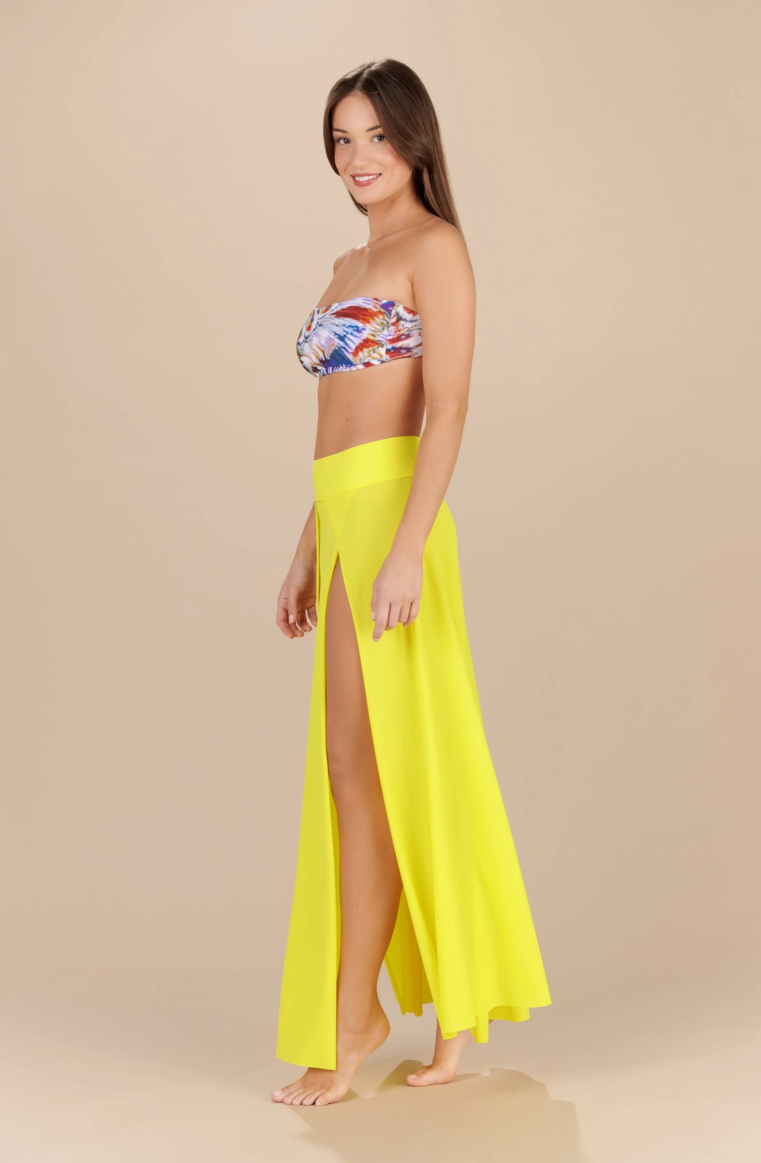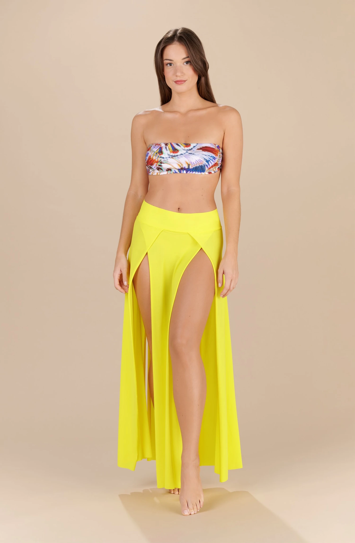 On laisse la vedette à notre jupe longue JAX en enfilant le haut de maillot JULYA jaune. Pour une allure glamour, on noue ses bretelles derrière la nuque ou dans le dos façon bustier. Celles qui préfèrent un look plus sophistiqué l’accorderont avec le haut MISI jaune qui s’orne d’une délicate guipure. Pour mettre un peu de couleur et de panache à notre tenue, on choisit le haut de maillot MAELYS imprimé LIDO. Ses petits volants en voile plissé nous offre rappelle la légèreté gracile de notre jupe. On aime aussi le push-up DONIA. Sur le même imprimé, il nous dessine un décolleté de rêve. Pour sortir, on choisit sans hésiter le crop-top cache-cœur LUIZA. Style boho chic avec cette petite chemise pleine de fougue.