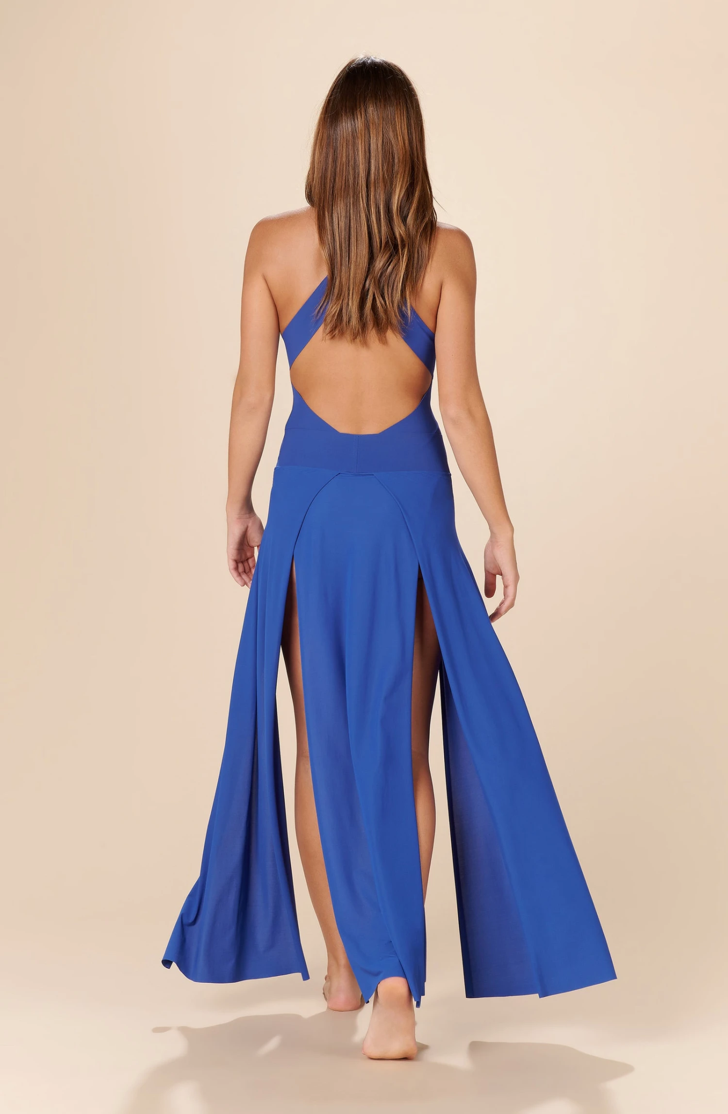 La jupe fendue JAX revisite les codes de la classique jupe longue évasée. Ouverte par quatre pans, son voile léger dévoile les jambes au rythme des mouvements. Aérienne, cette pièce habille avec caractère une tenue de plage. Le coloris océan, un bleu abyssal qui donne envie de prendre le large.