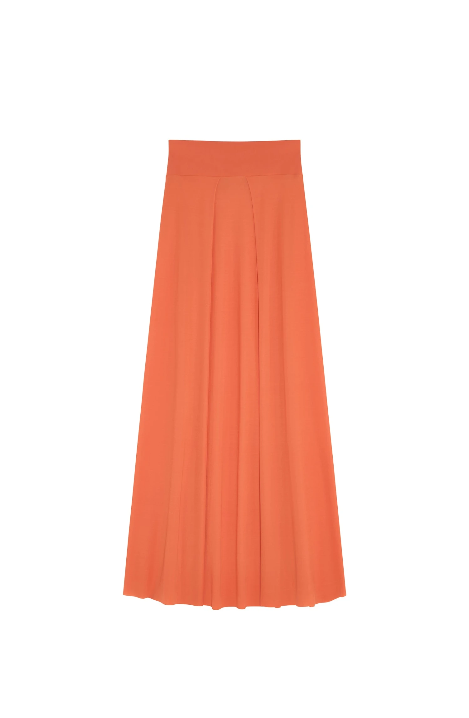 Jupe longue évasée fendue, ouverte par 4 pans en voile maintenus par une large ceinture en « bonded ». Finitions découpe free-cut.