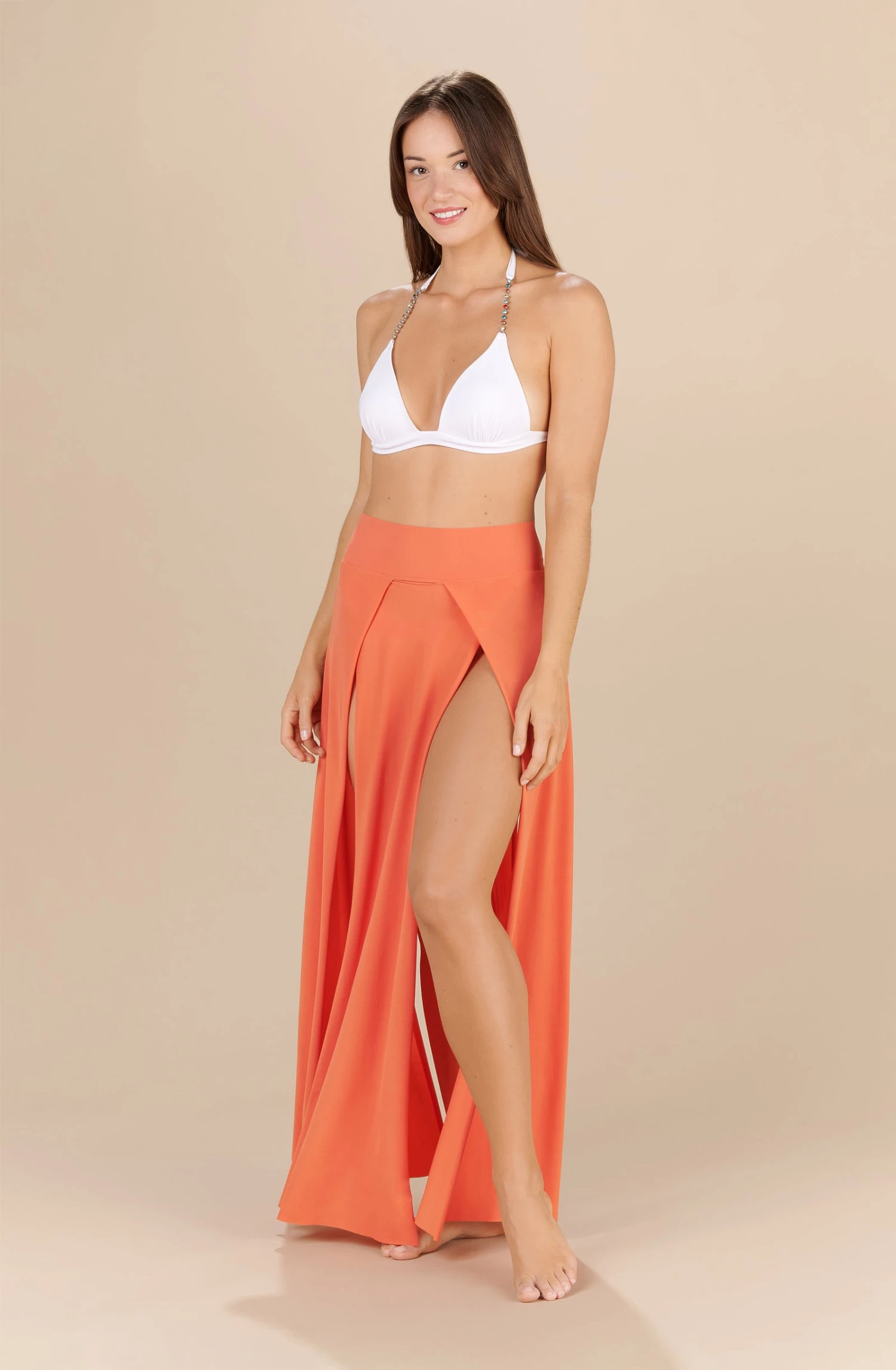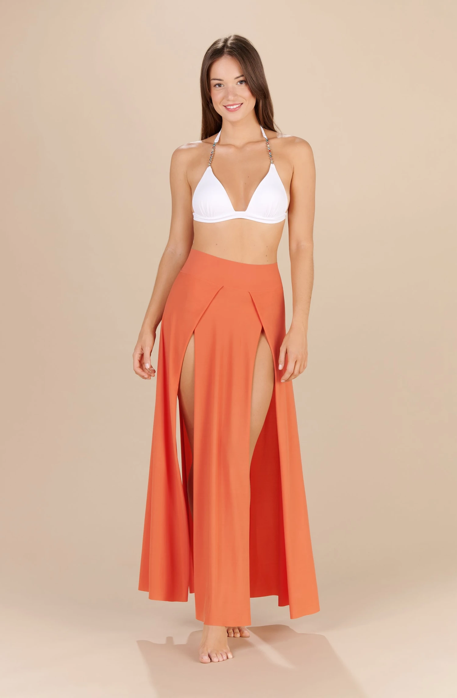 La jupe fendue JAX revisite les codes de la classique jupe longue évasée. Ouverte par quatre pans, son voile léger dévoile les jambes au rythme des mouvements. Aérienne, cette pièce habille avec caractère une tenue de plage.
