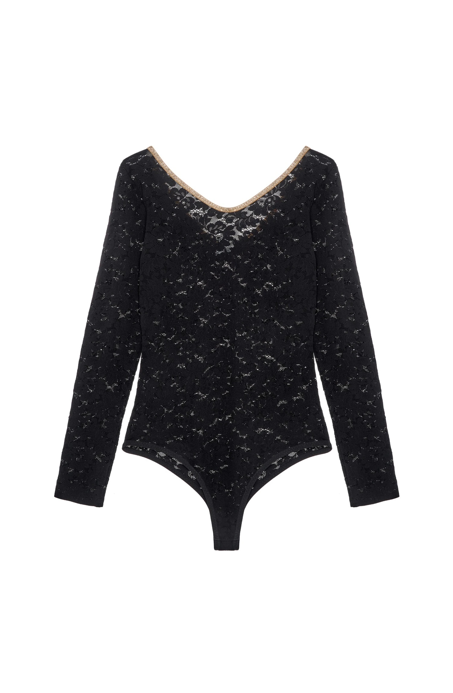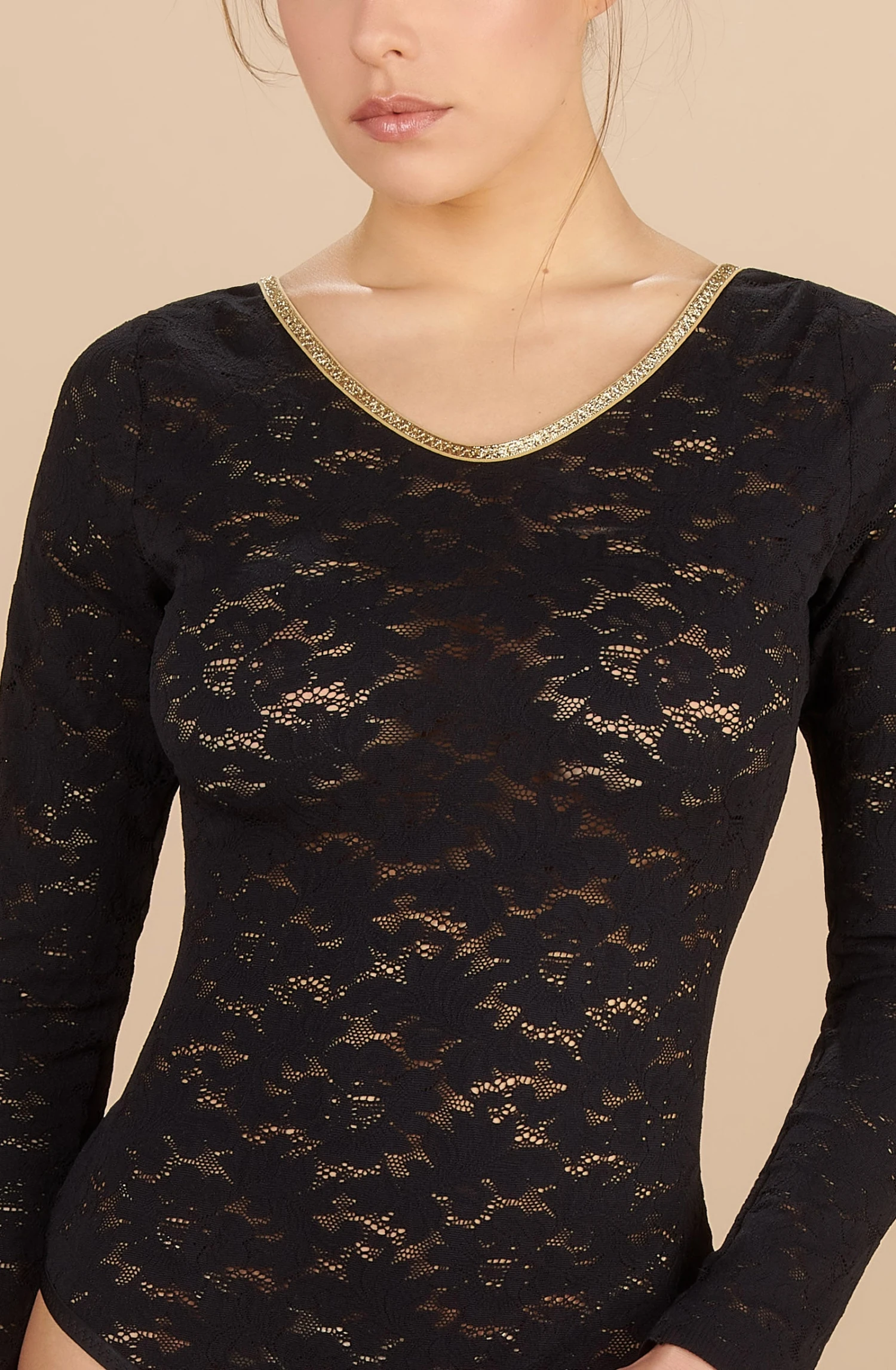 Body culotte à manches longues, décolleté devant et dos, élastique plié doré en finition. Dentelle Française.