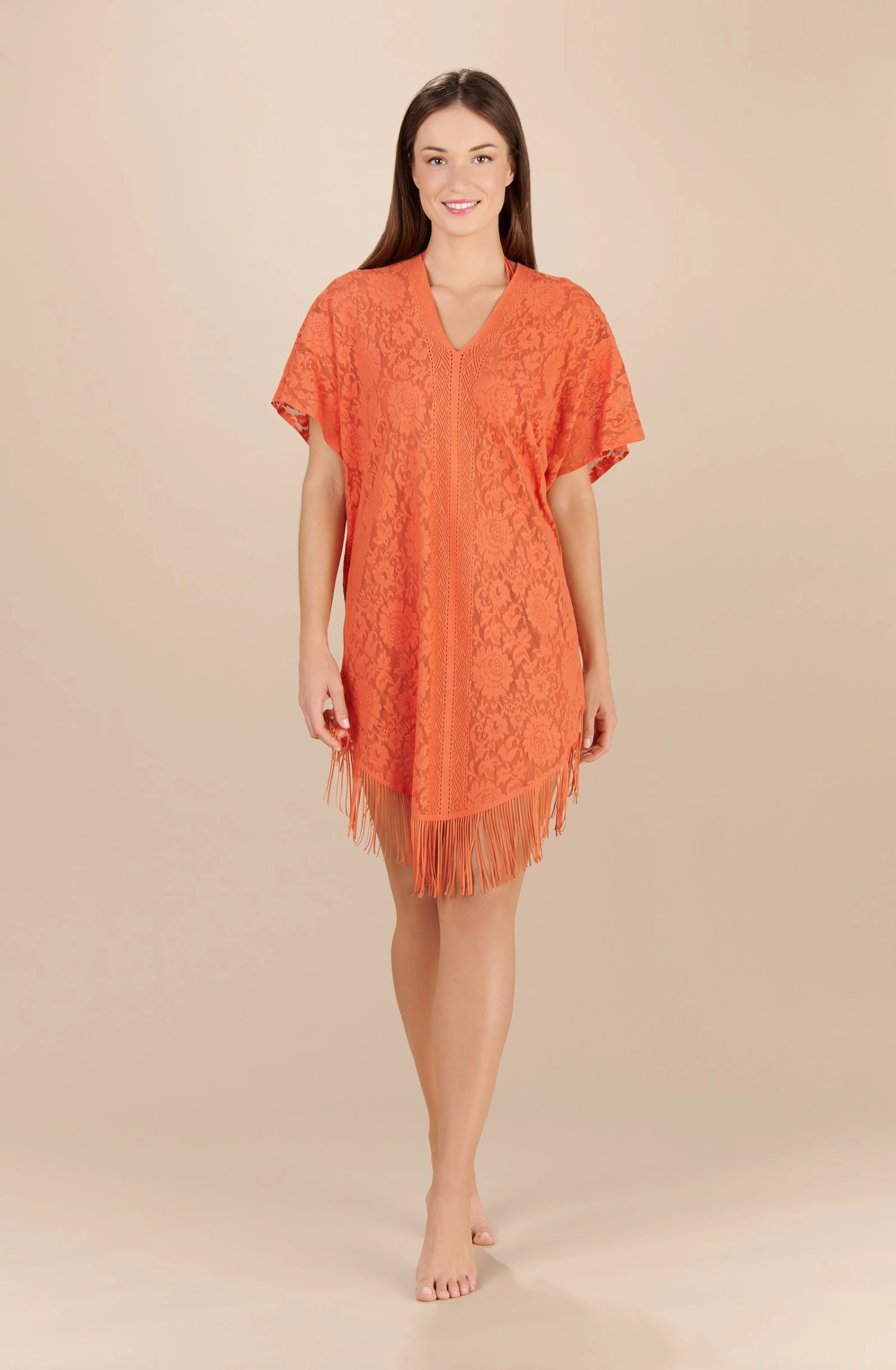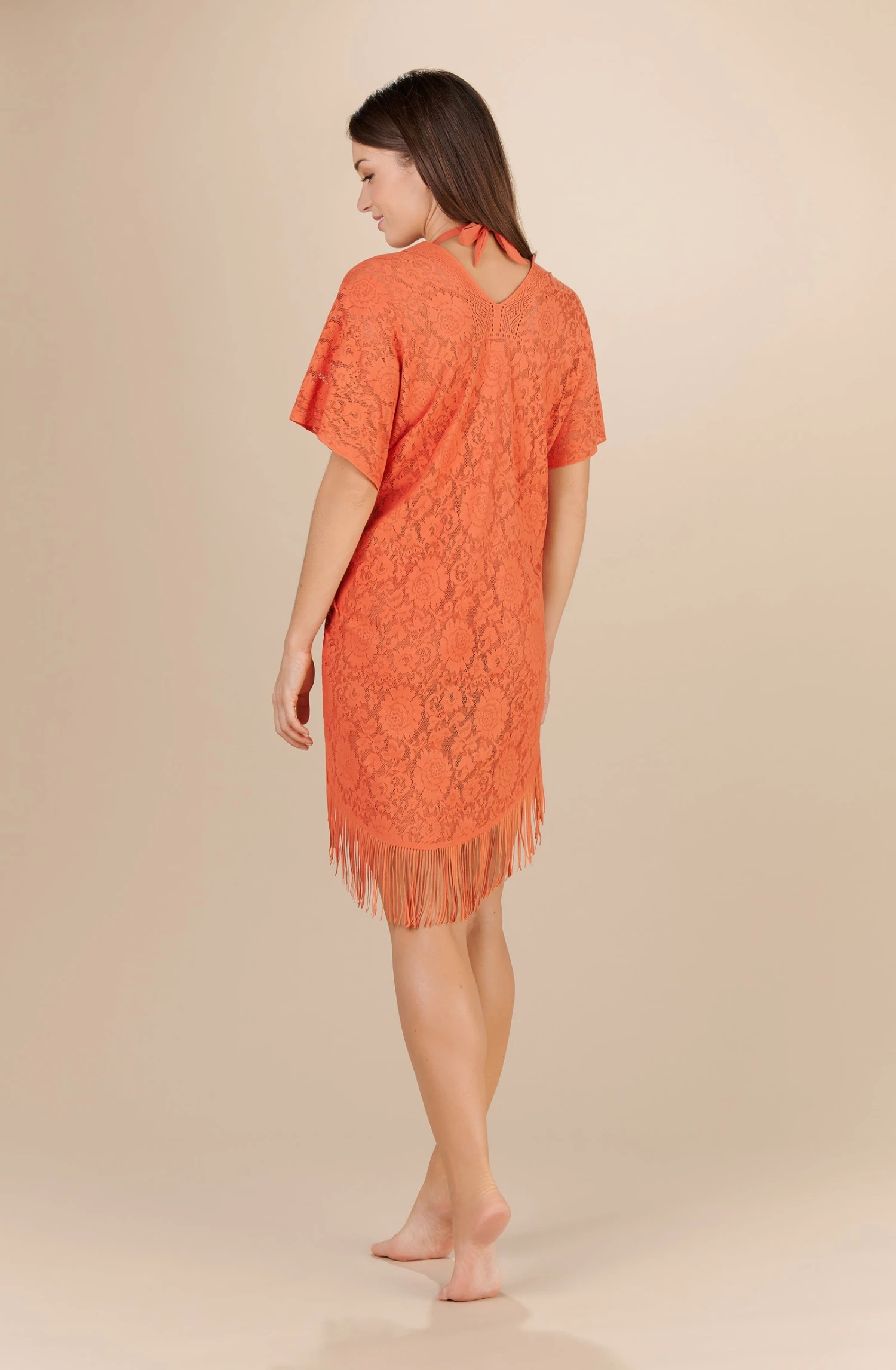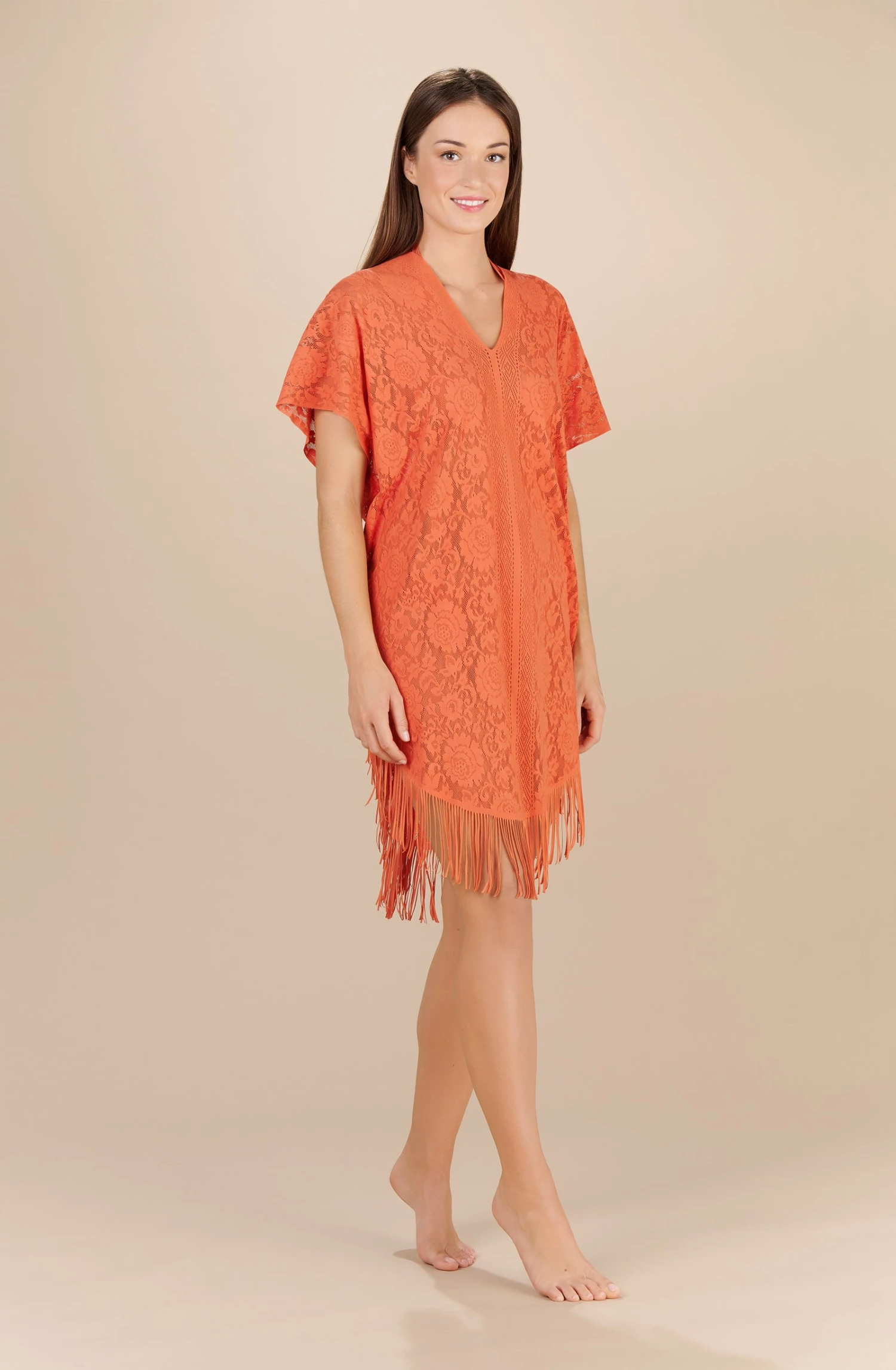 Tunique poncho à franges en dentelle couvrante. Découpe arrondie sur le bas. Encolure en V devant et dos. Matière tricotée en FRANCE.