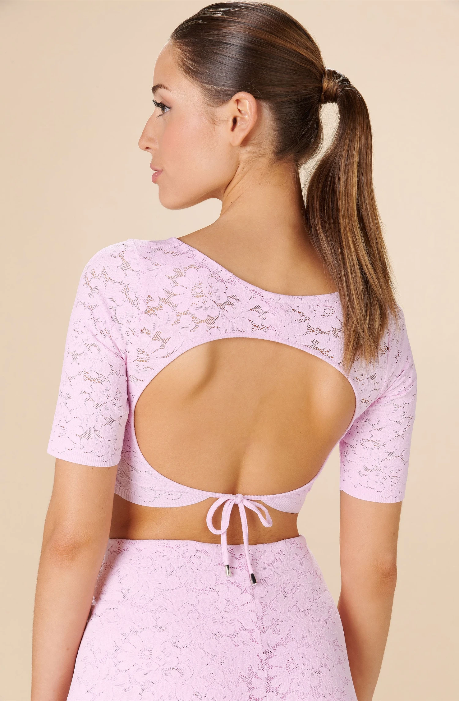 Le crop-top KALLIOPE en dentelle se pare d’une découpe dos nu à nouer très graphique. Ce modèle sophistiqué présente une doublure en tulle chair sur le devant pour plus d’opacité. Un rose doux résolument féminin.