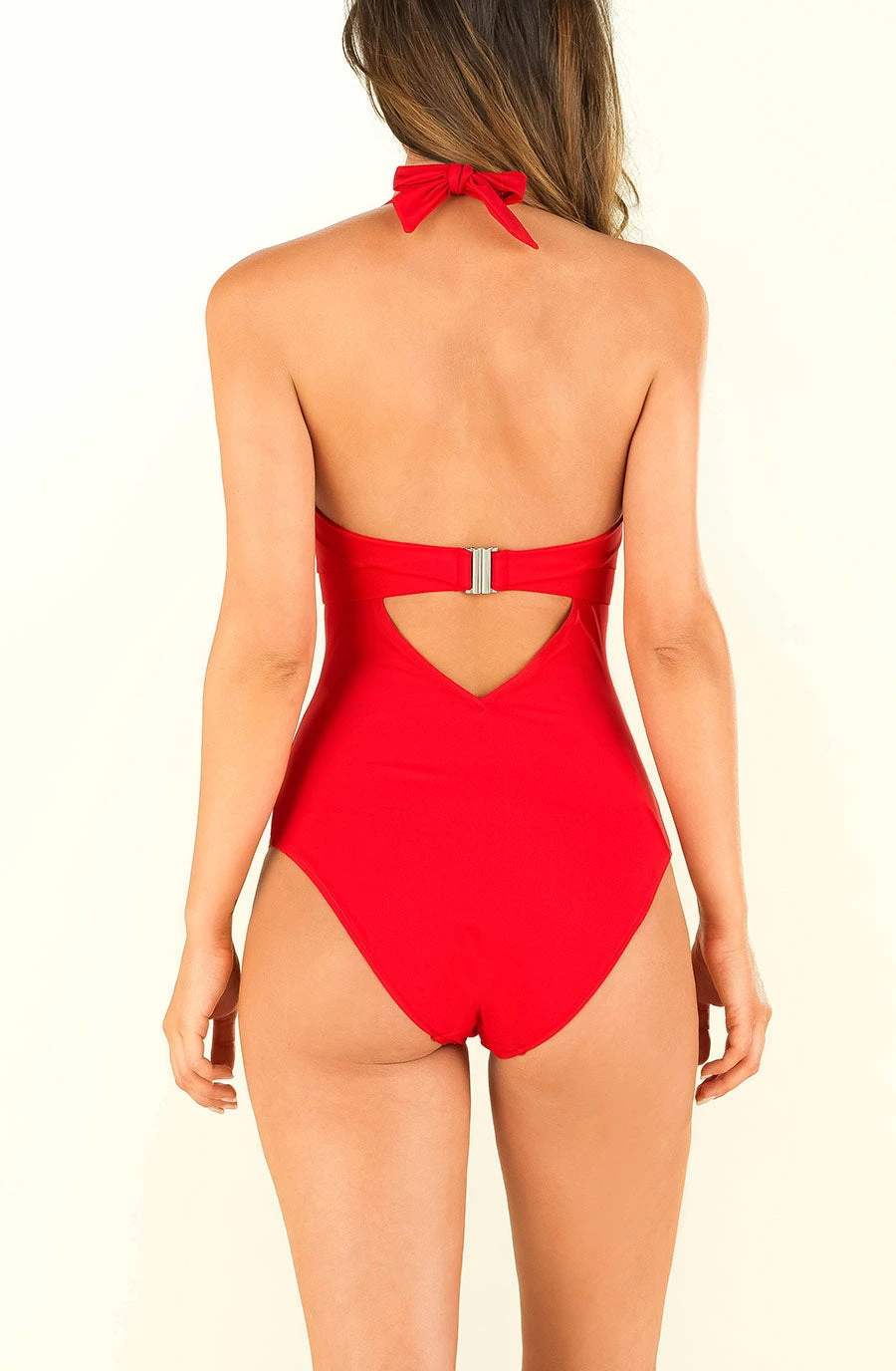 Sur la plage ou en version body sous un jean, ce modèle fera forte impression et son coloris rouge saura s’accorder avec toute votre garde-robe. Le maillot une pièce LAAM red se noue dans la nuque par de larges bretelles, et dans le dos par un grand crochet-clip en argent. Sa coupe triangle au profond décolleté V met en valeur la poitrine.