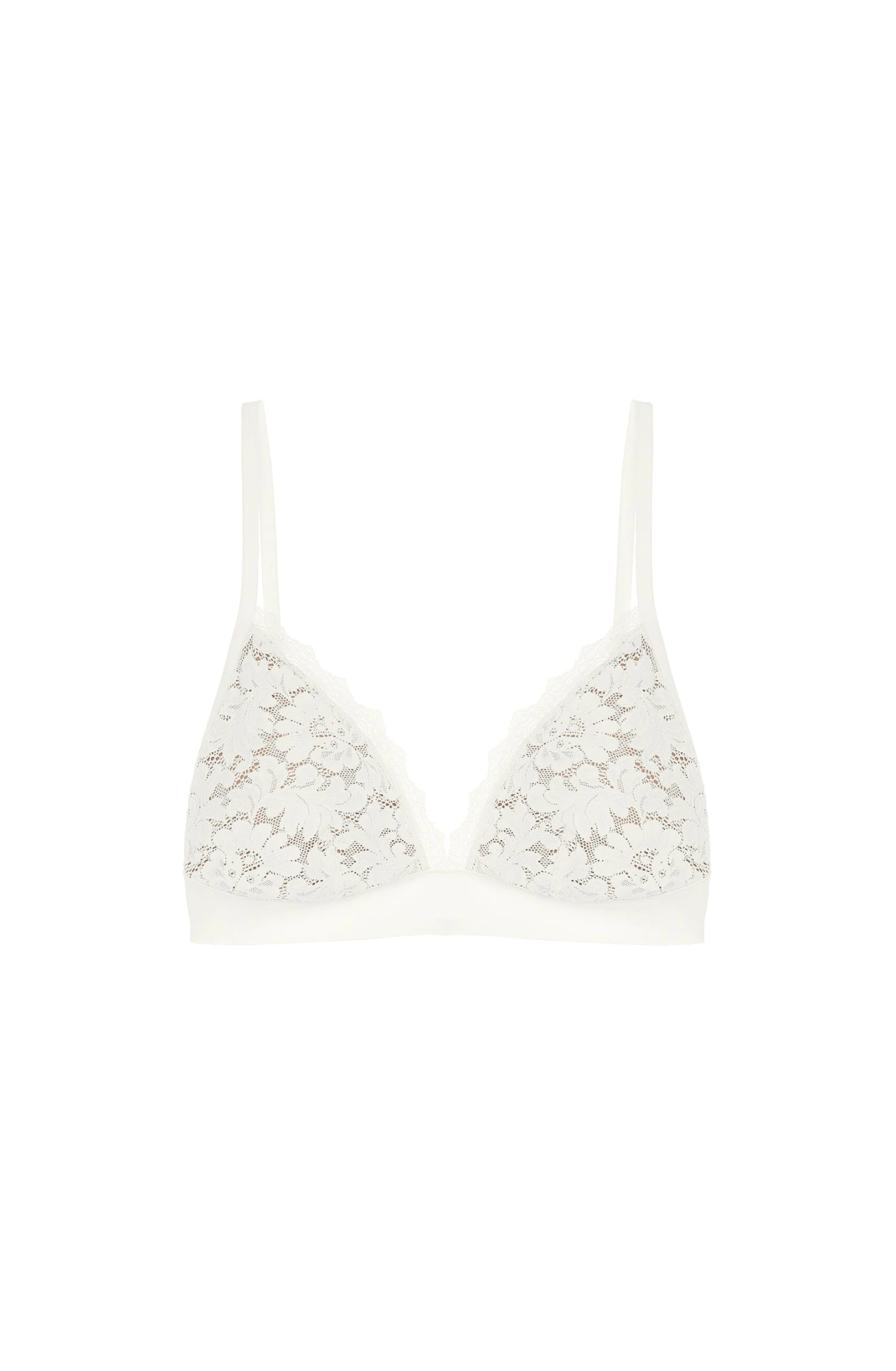 Soutien-gorge blanc écume triangle en résille de dentelle, doublé de tulle chair. Coques amovibles. Bande sous poitrine en bonded finition « free cut ». Agrafe au dos, bretelles réglables.