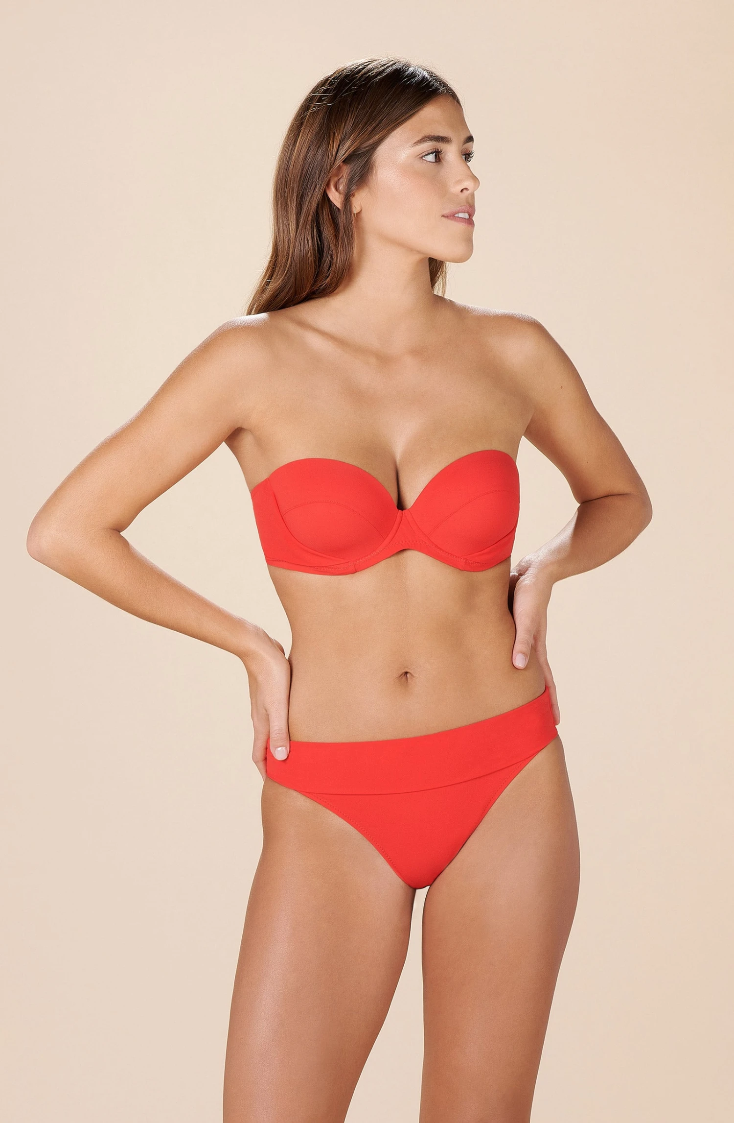 Le maillot de bain à coques LISIA met en valeur les poitrines généreuses. Ses larges bretelles de différentes façons tout en optimisant le confort et le maintien : nouées nuque, aux épaules façon brassière, croisées dos, rabattables à l’arrière pour former un bandeau. Un rouge éclatant et audacieux, couleur intemporelle du dressing balnéaire.