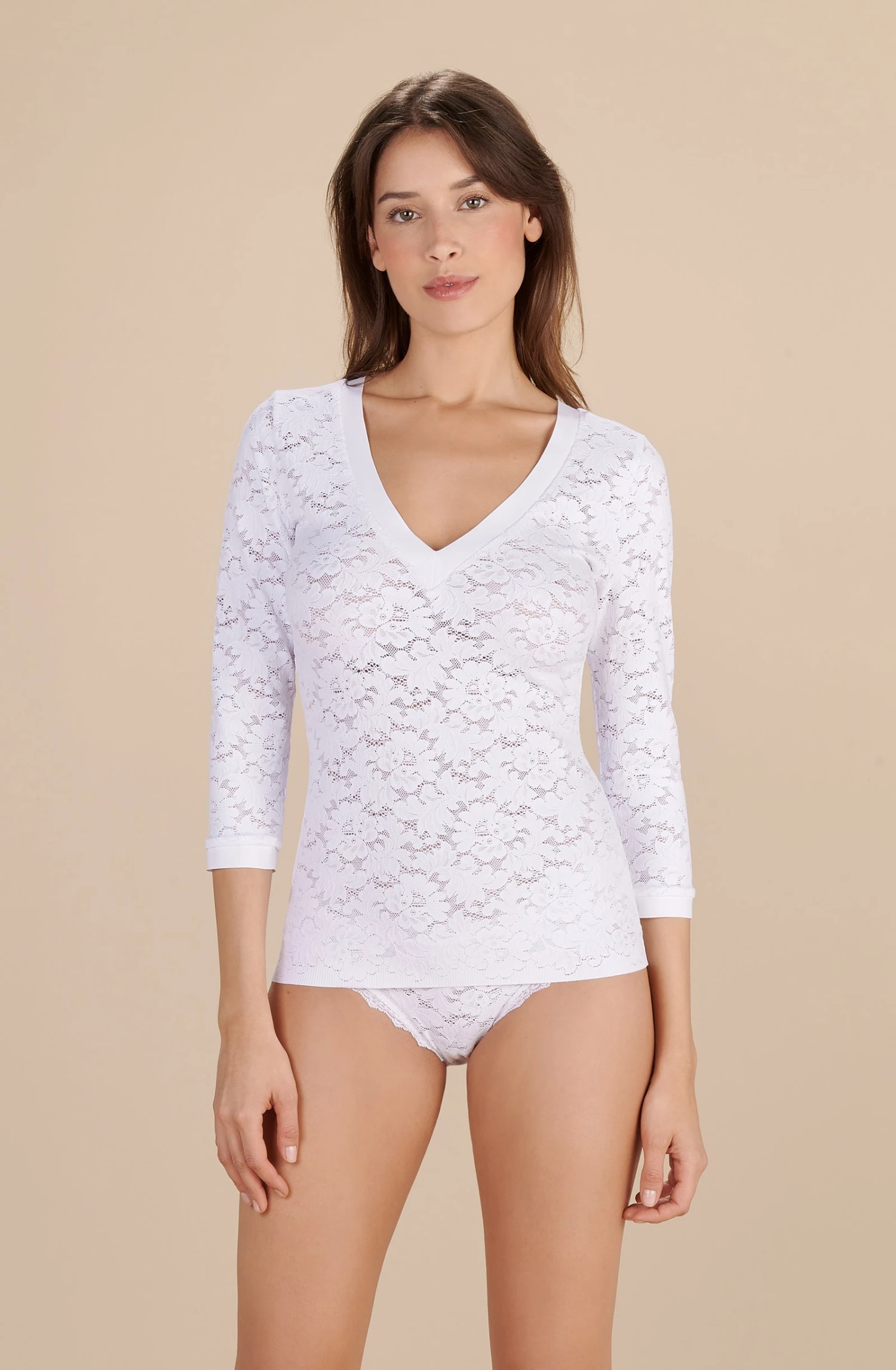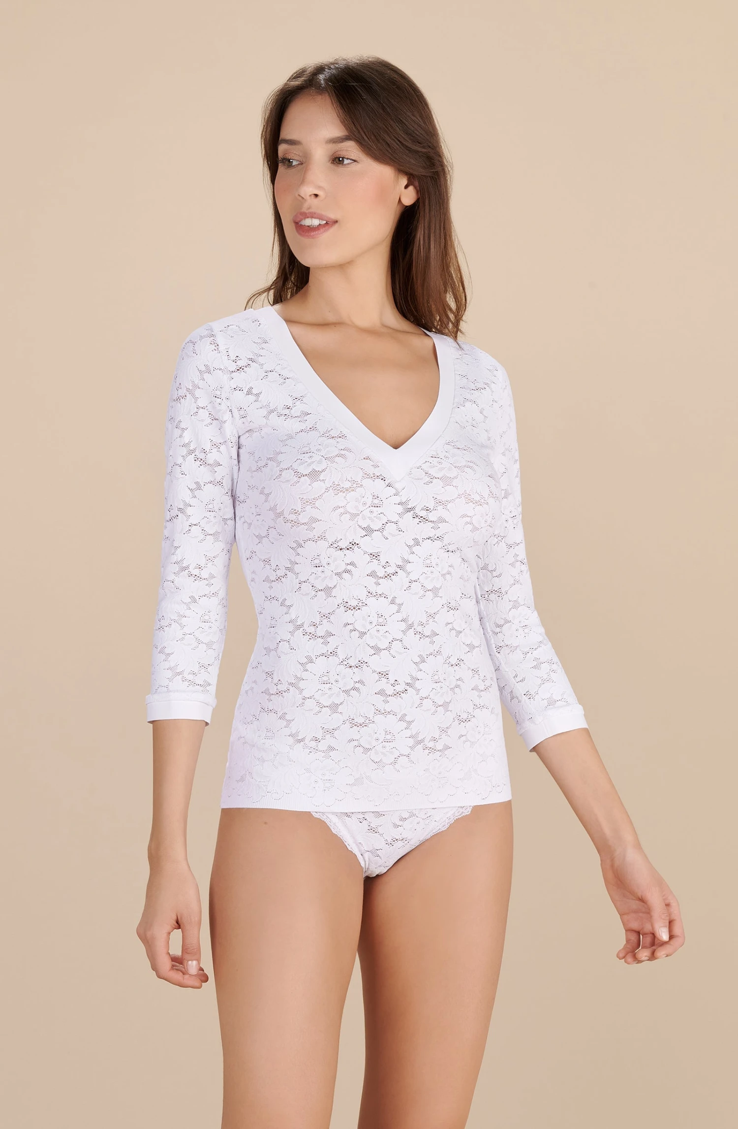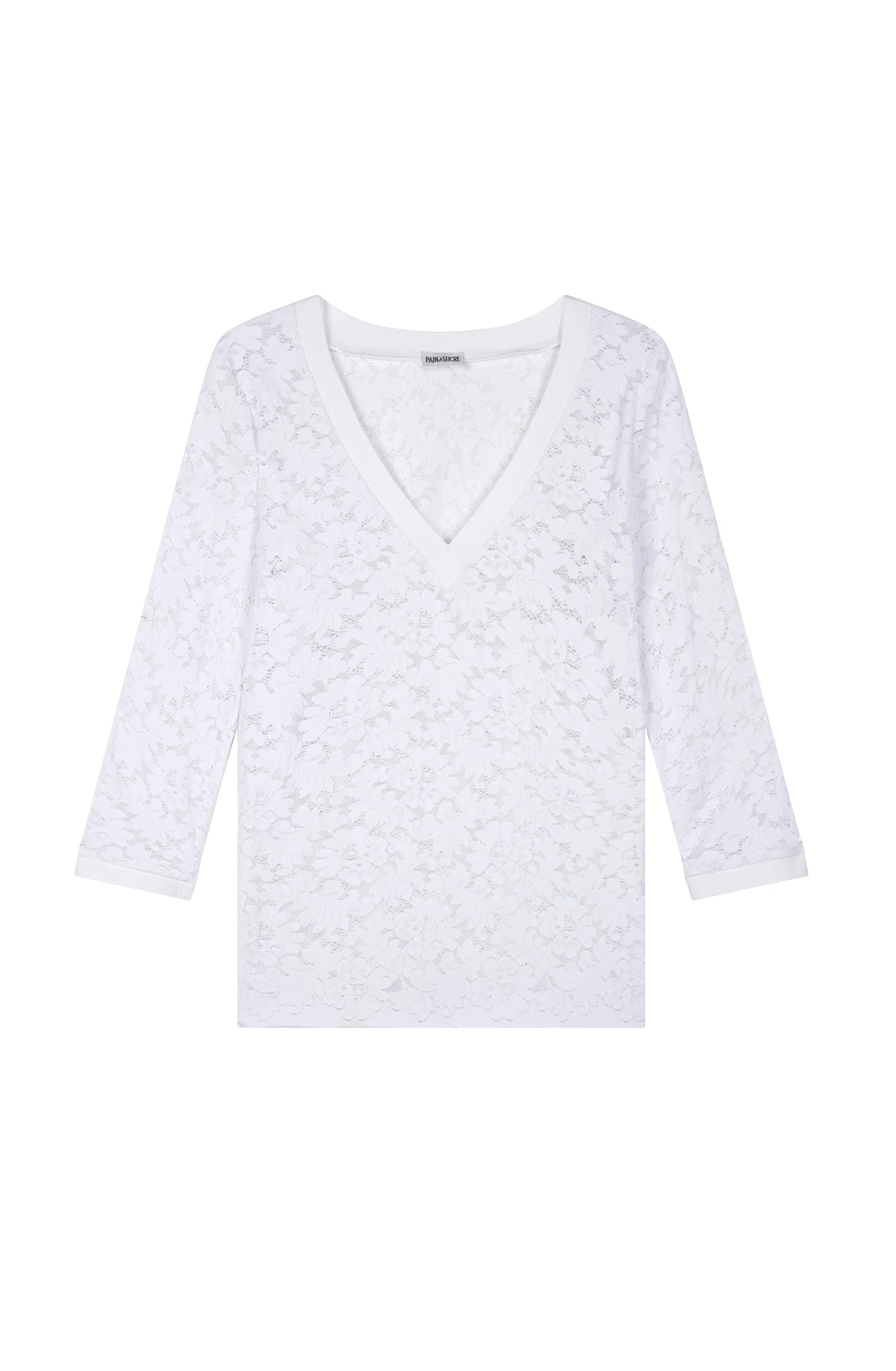 Top dentelle à manches 3/4. Décolleté en V, finition en Bonded, encolure et bas de manches découpe bords à cru.