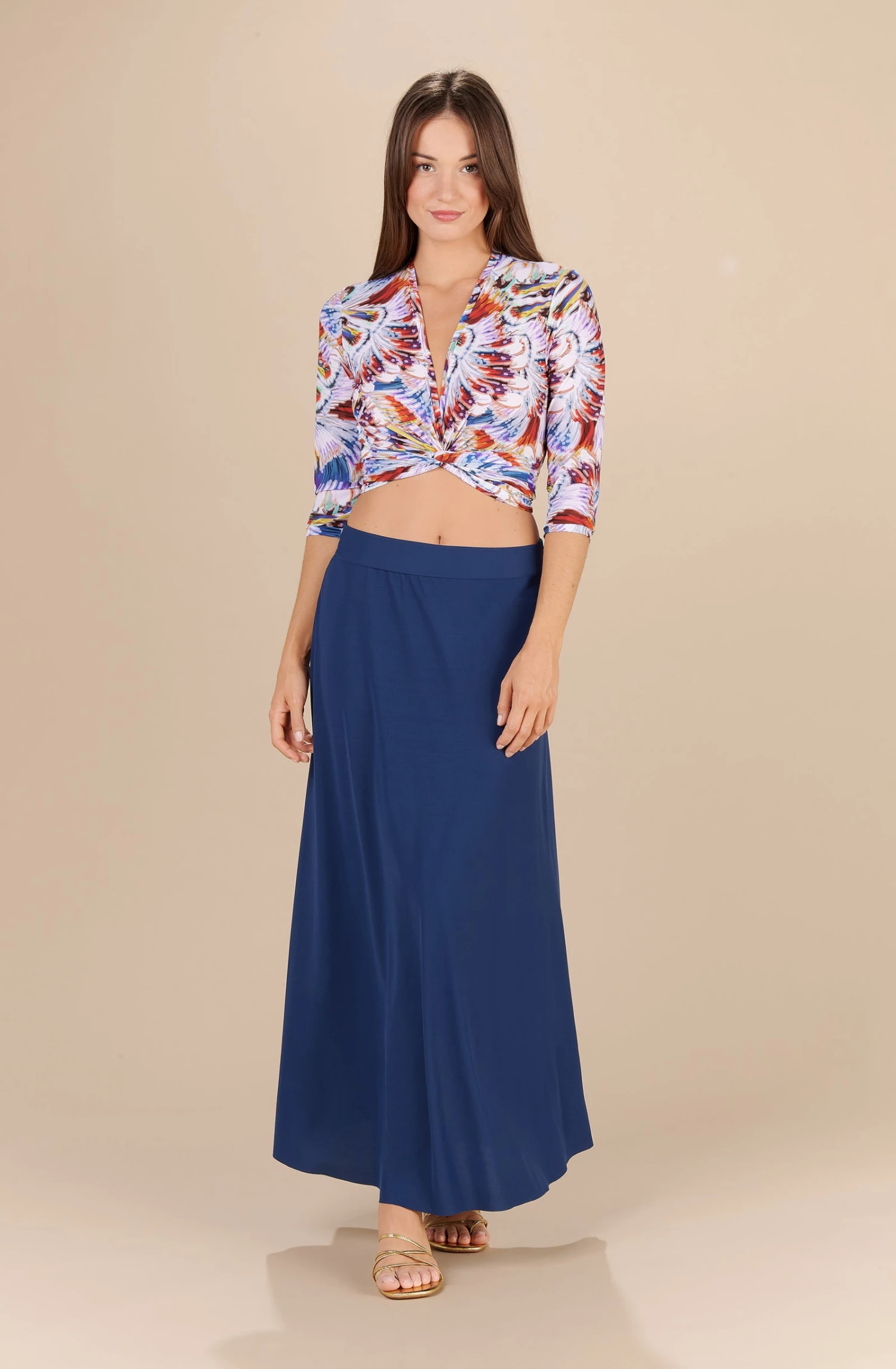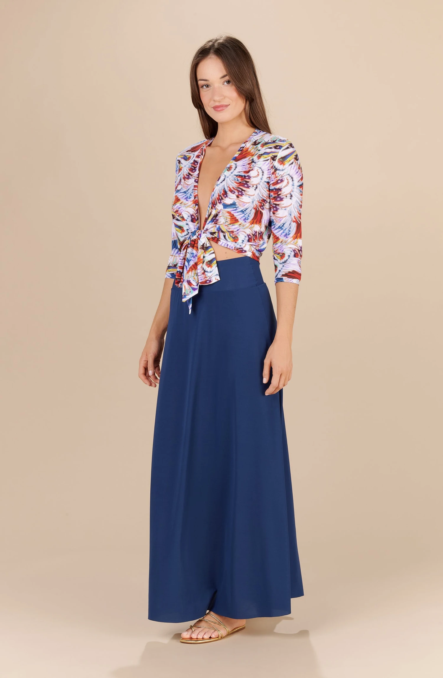 Haut cache-coeur à manches 3/4 en voile léger. Large ceinture à croiser devant ou dos. Finition bandes pliées sur le décolleté et le bas des manches.