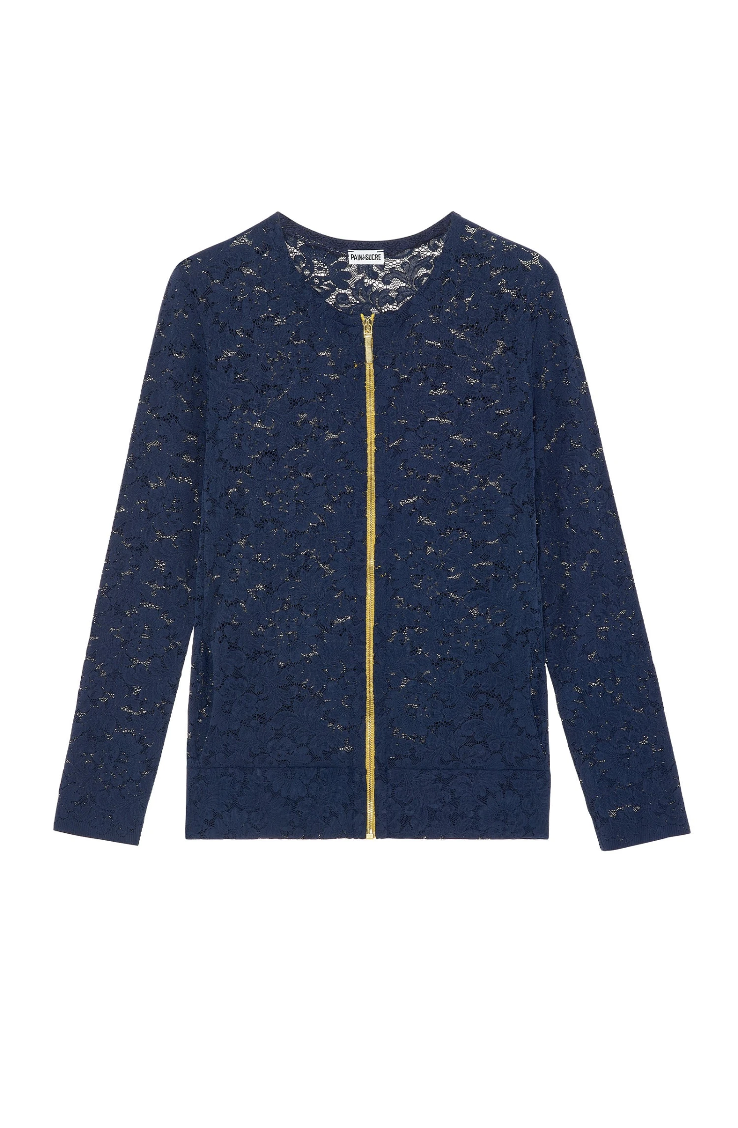 Allure chic et sportive pour le gilet zippé LUYNA marine. Avec sa dentelle fine et sa fermeture éclair dorée, ce petit blouson homewear réchauffe l’hiver et se détourne avec style pour une tenue workwear élégante et féminine.