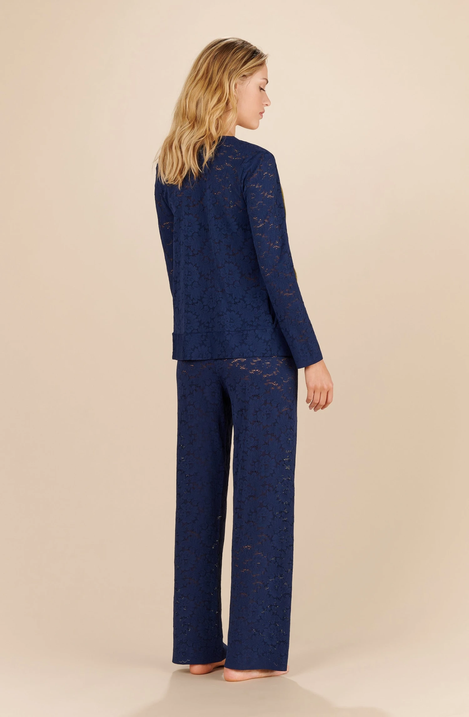 Le gilet raffiné LUYNA dévoile avec éclat les finitions en lurex doré du caraco SPENCER. Il s’assortit en bas du pantalon en dentelle marine POOJA qui se superpose élégamment sur le shorty iconique taille haute BOBBY. Dans les mêmes nuances marines, la fluide viscose du caraco NAHRA et du pantalon ample PRADY couvre la silhouette avec douceur.
