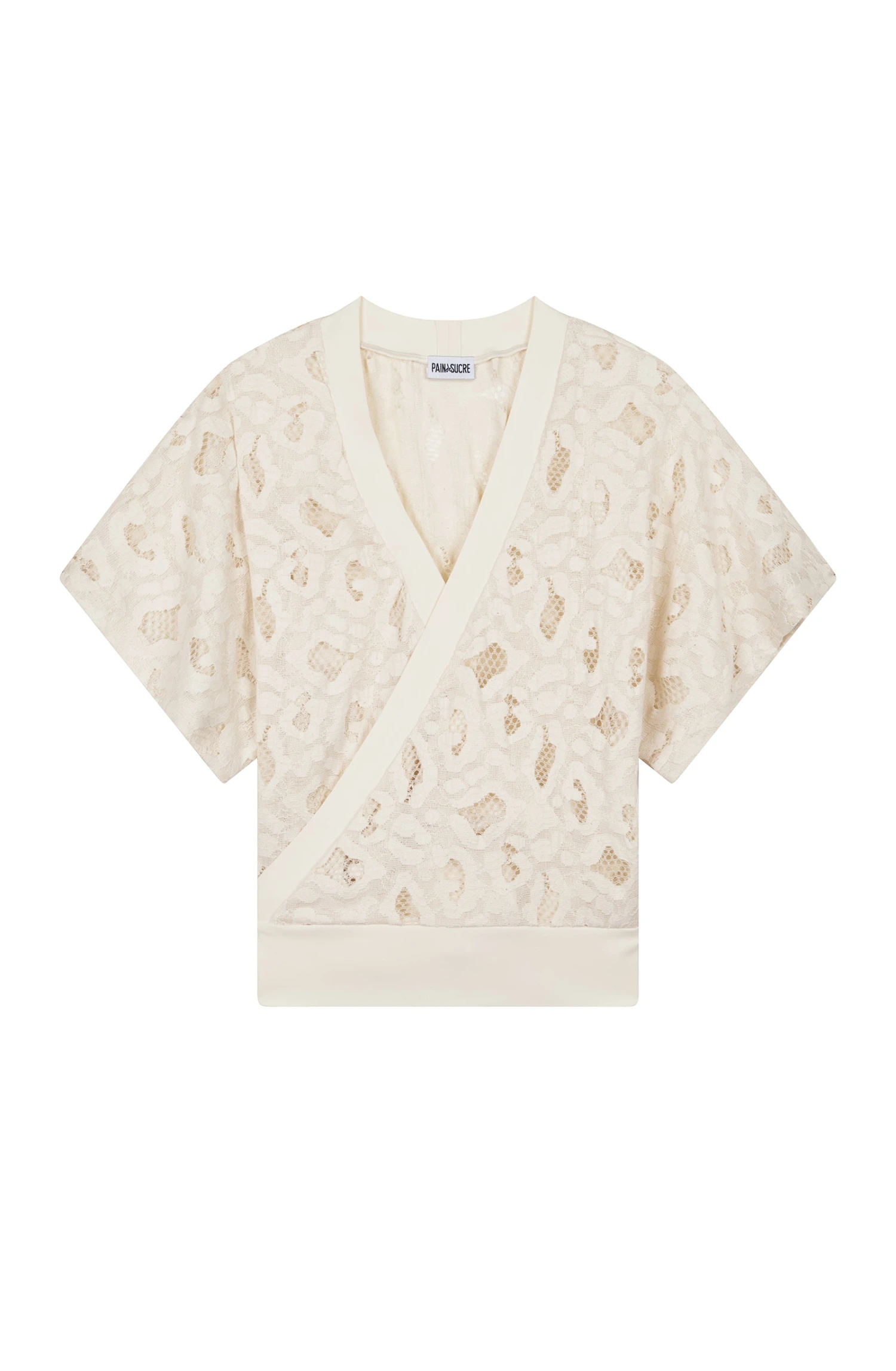 Cache-coeur en dentelle, manches courtes amples. Décolleté et ceinture en Bonded.