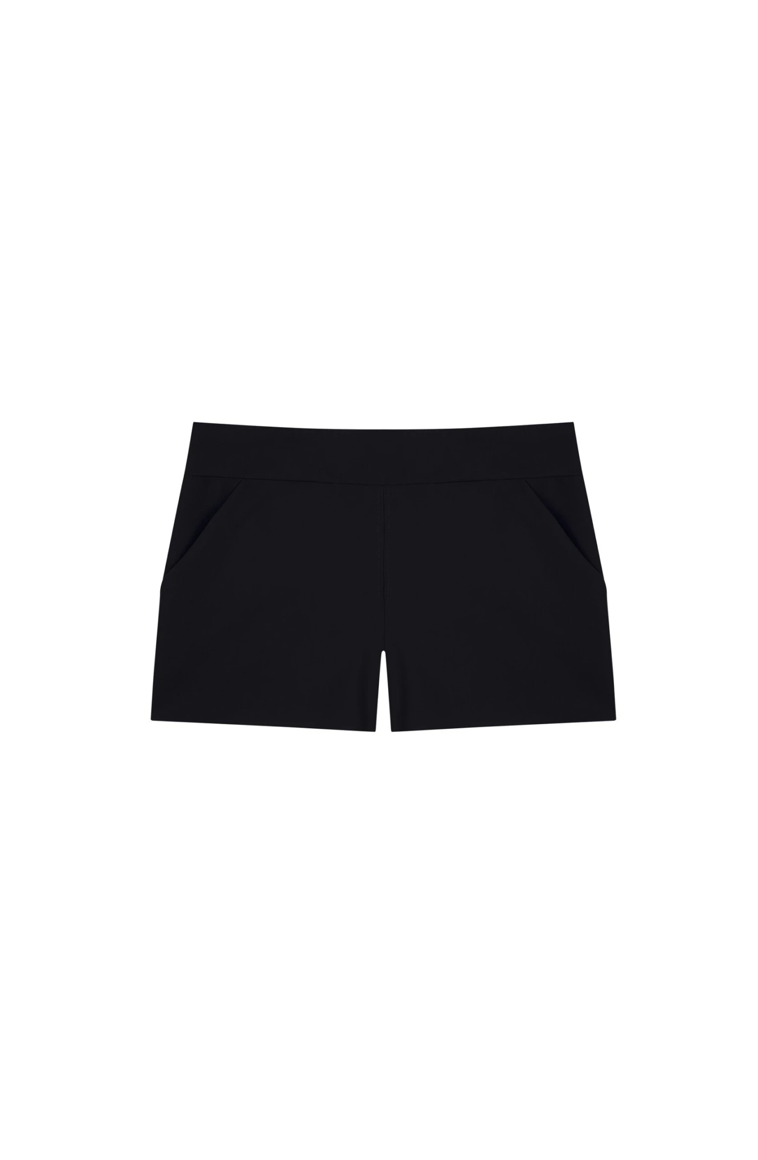 Short ample noir entièrement en bonded. Large bande à la taille, 2 poches sur les côtés.