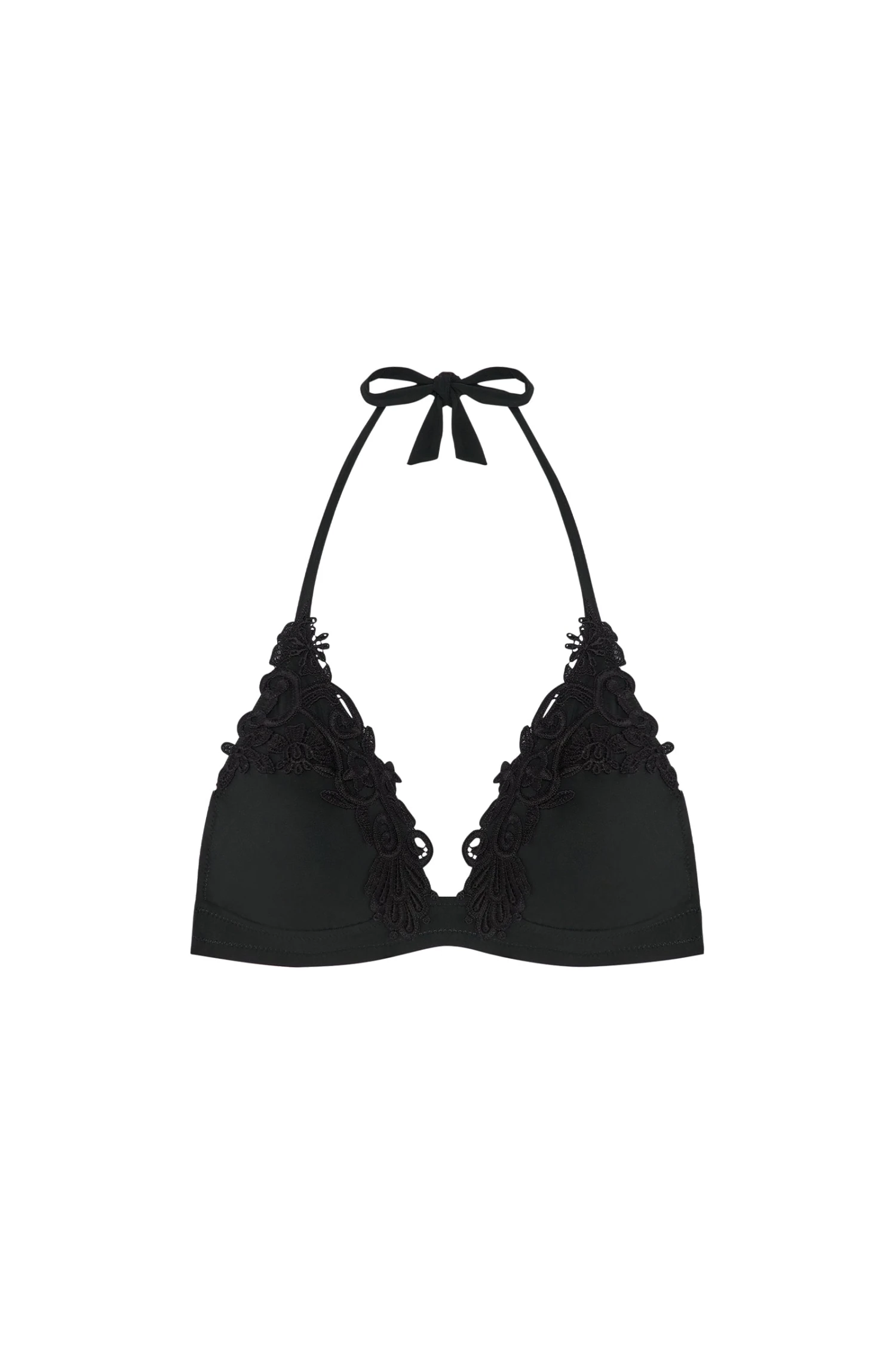 Haut de maillot triangle. Bande sous poitrine. Fines bretelles nouées nuque. Guipures coordonnées 100% coton sur les bonnets. Fermeture crochet-clip dos en zamac argenté.