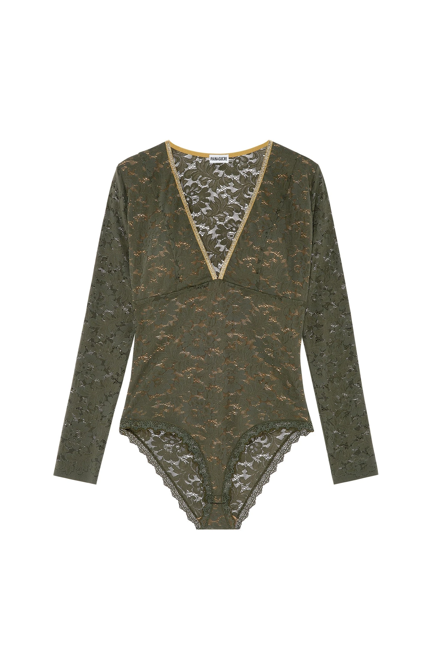 Dentelle raffinée et décolleté profond, le body MYLDI kaki se déploie tout en délicatesse et sublime les formes. Dans un subtil jeu de douceur et de volupté, ce body à manches longues illumine avec chic nos tenues hivernales.