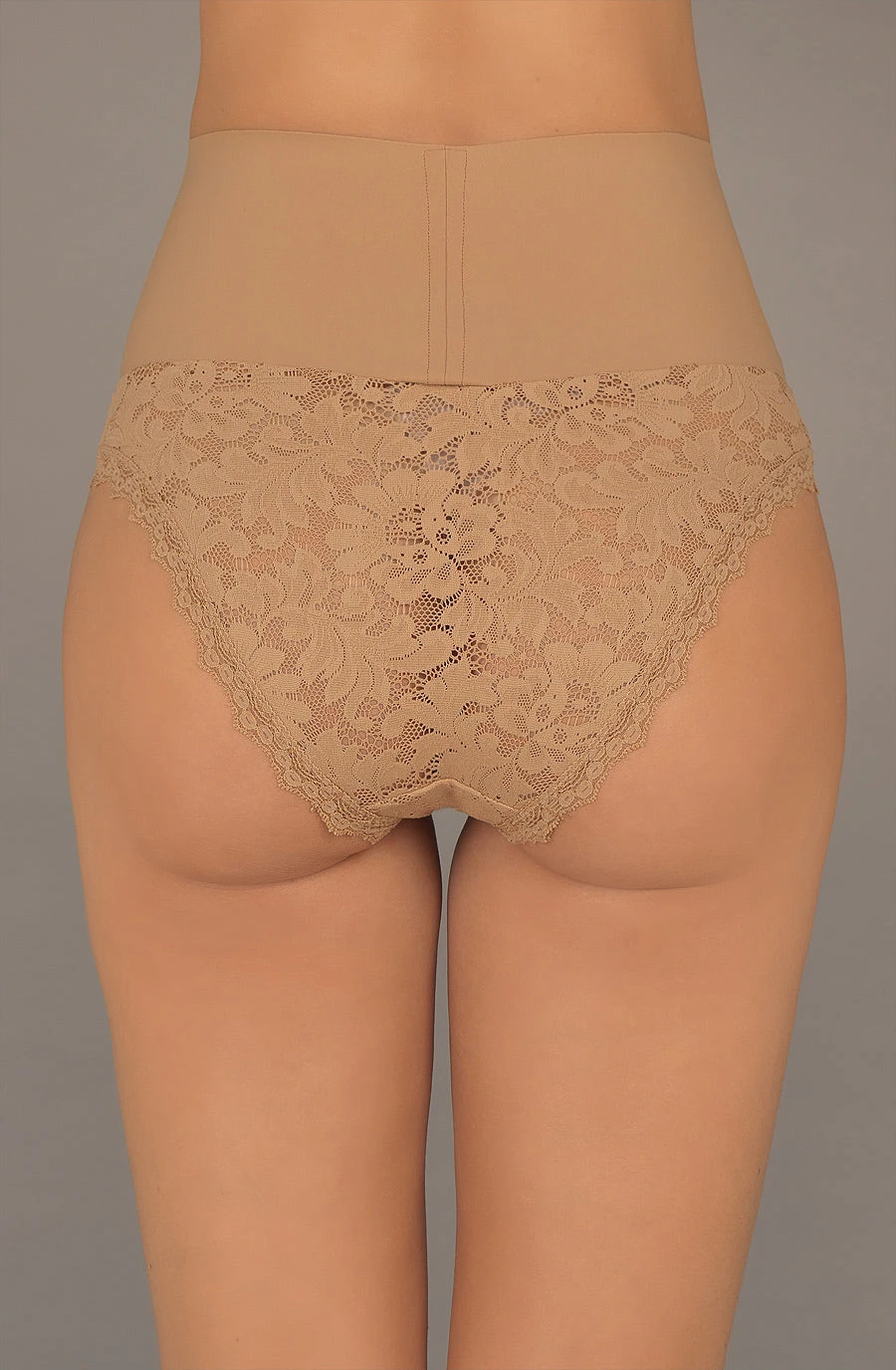 Culotte haute en résille de dentelle biscuit, finition tour de cuisses coordonnée. Taille haute gainante en bonded finition « free cut ».