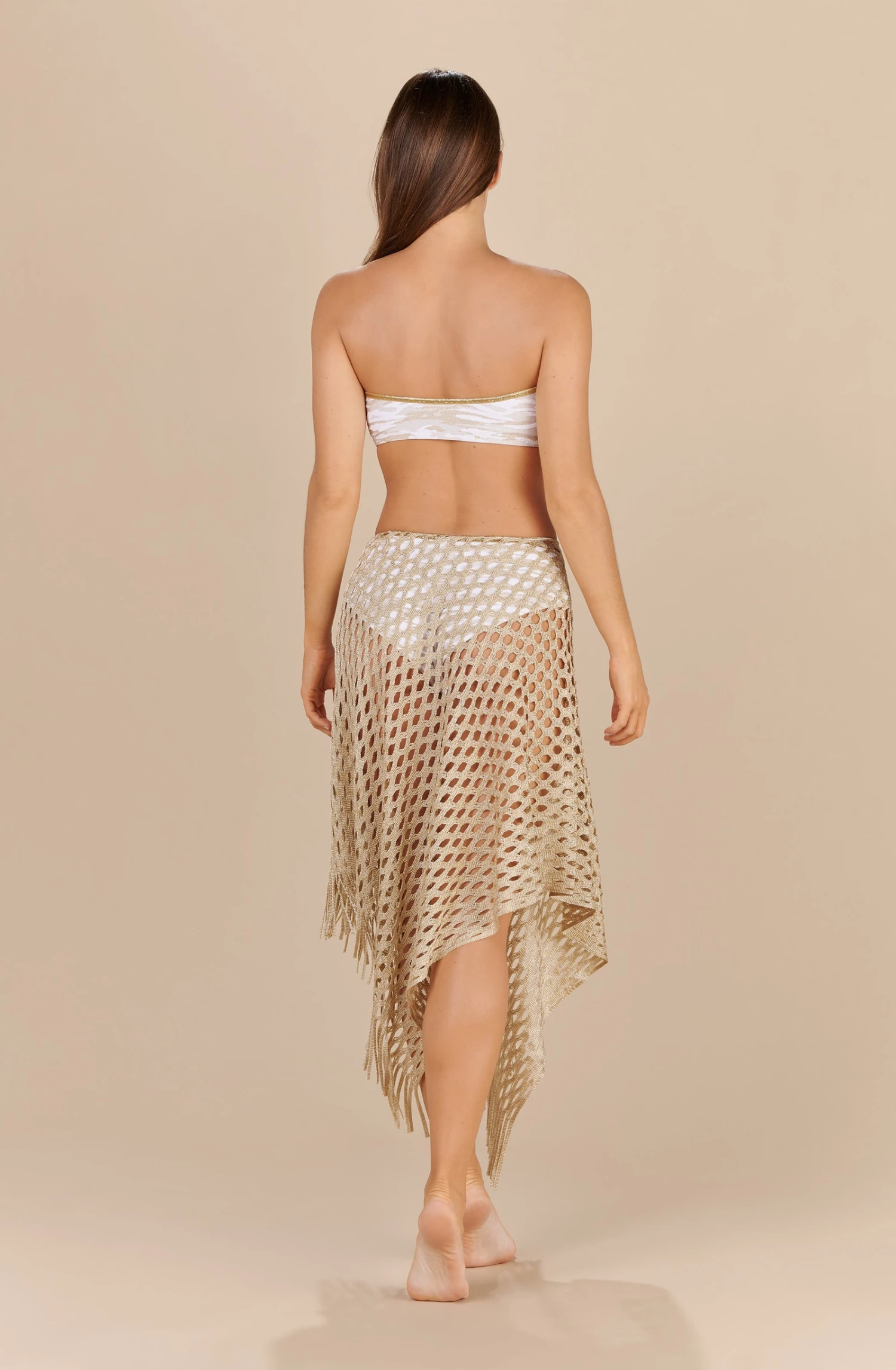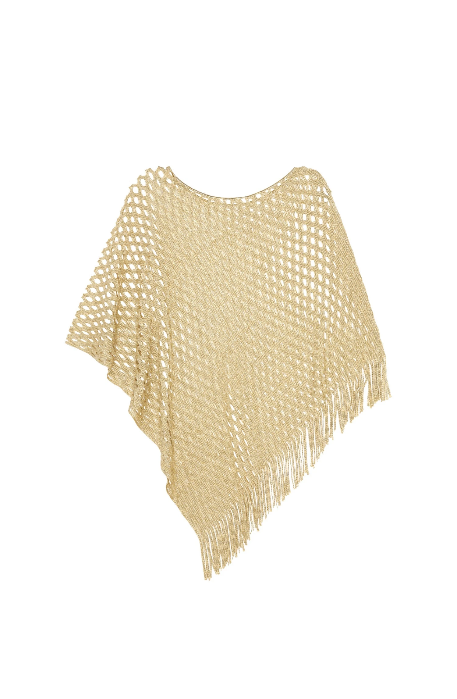 Poncho à franges en pointe. Large résille dorée ajourée.