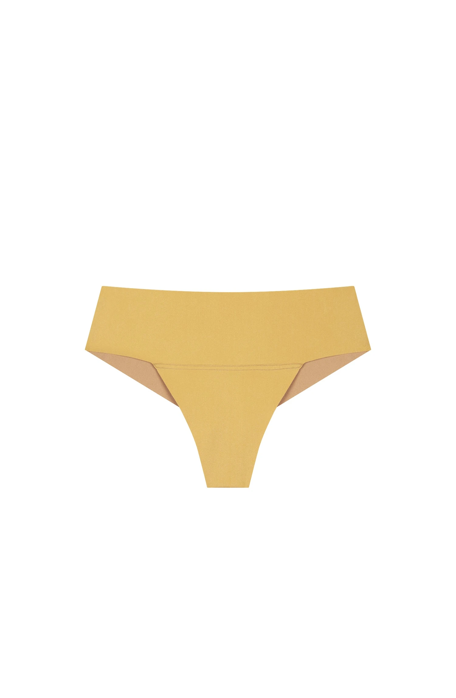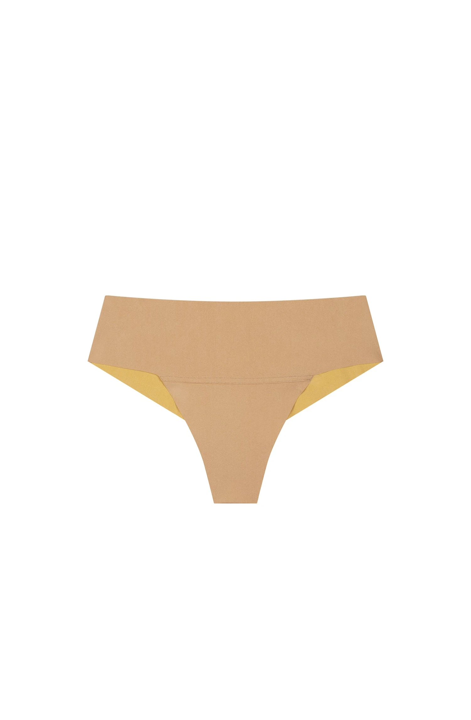 Telle une seconde peau, le tanga PERBY nous couvre de douceur grâce à sa microfibre irisée. Sa coupe échancrée met en valeur nos courbes féminines et donne un effet rebondi au fessier. Discret, cette culotte, couleur chair et finition free cut, a tout pour se faire invisible sous toutes nos tenues. Le brésilien PERBY nous comble avec son tissu réversible, une face plus discrète, beige, et une autre plus éclatante, couleur or, pour sublimer notre peau dorée.