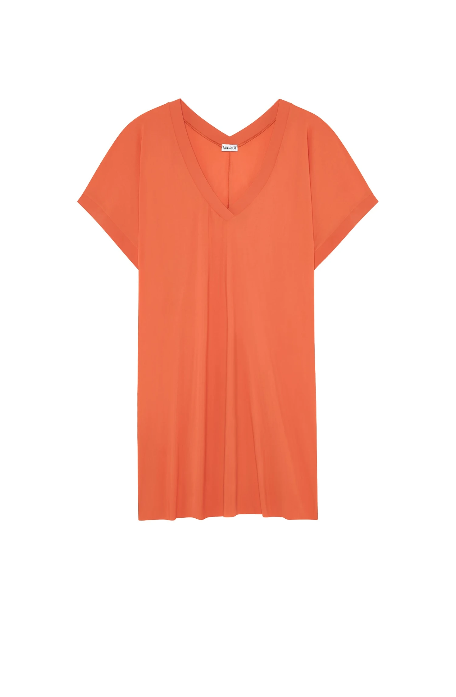 Tunique ample en voile léger, fendue sur les côtés. Manches 3/4. Finition encolure et bas de manches en « bonded ». Décolleté devant et dos en V. Finition bas découpe free-cut.