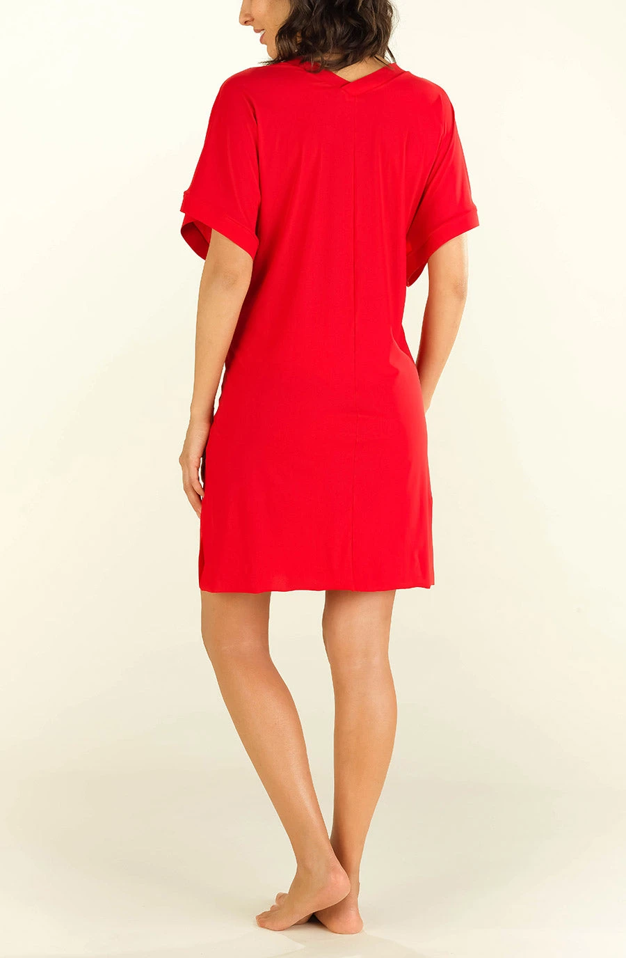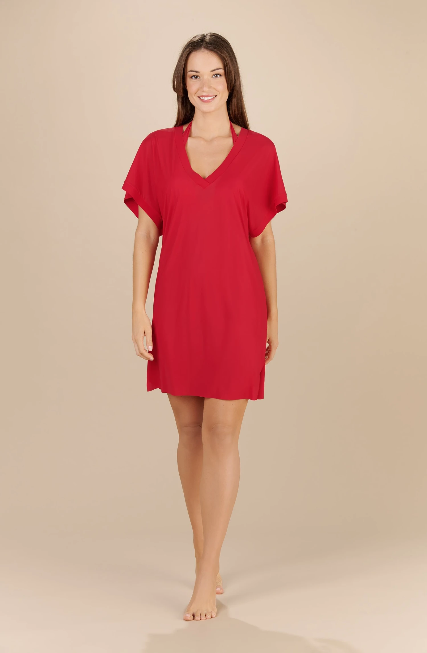 Tunique ample red, manches 3/4 en voile léger, avec décolleté en V devant et dos. Fendue sur les cotés. Finitions encolure et bas de manches en Bonded, free cut.