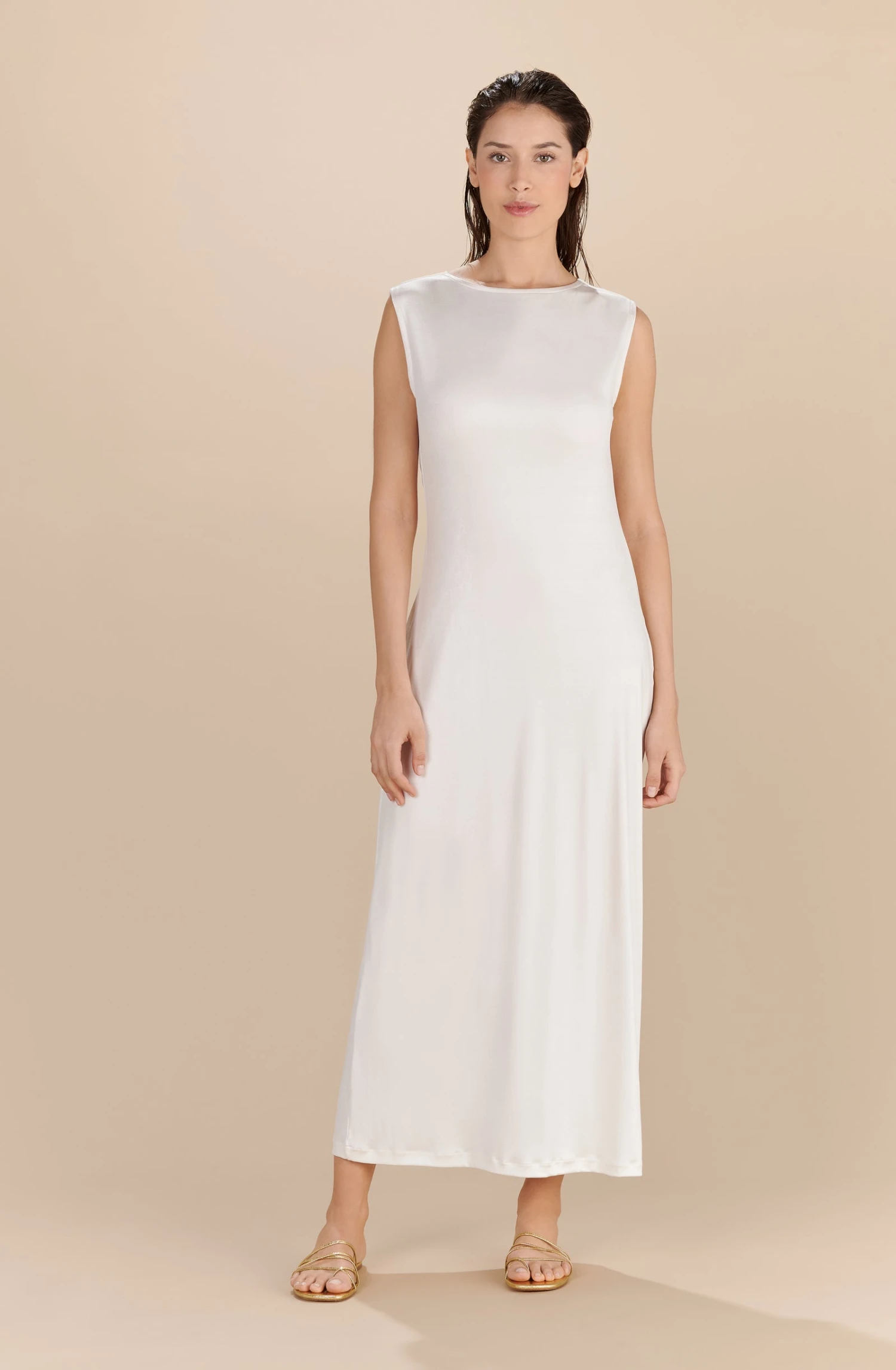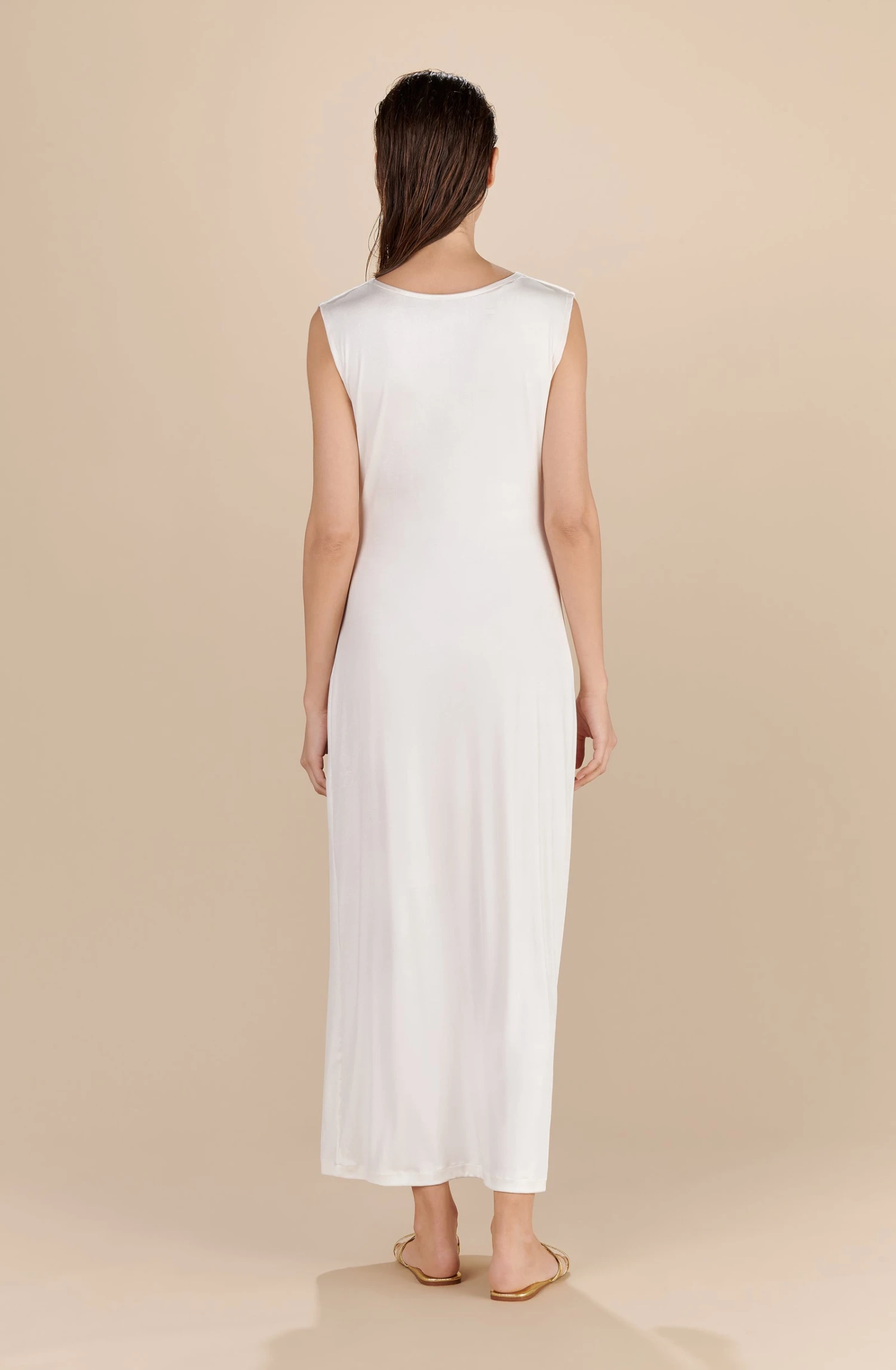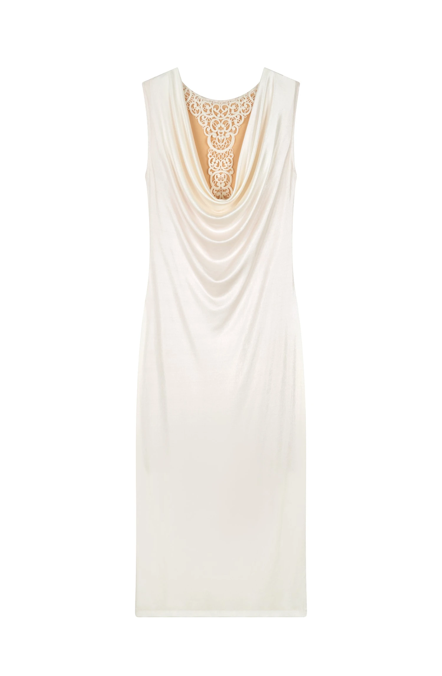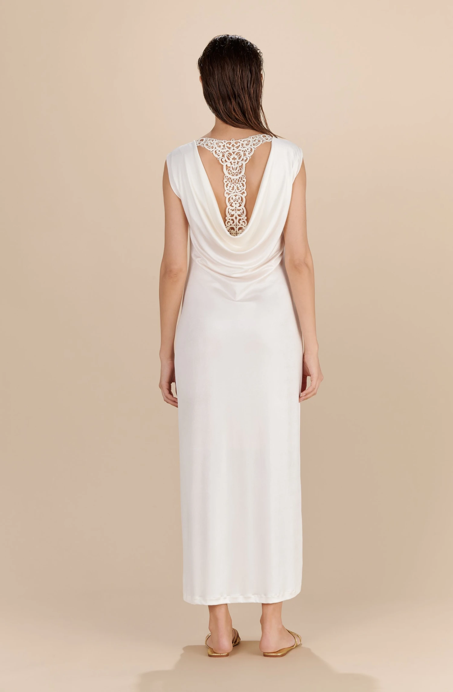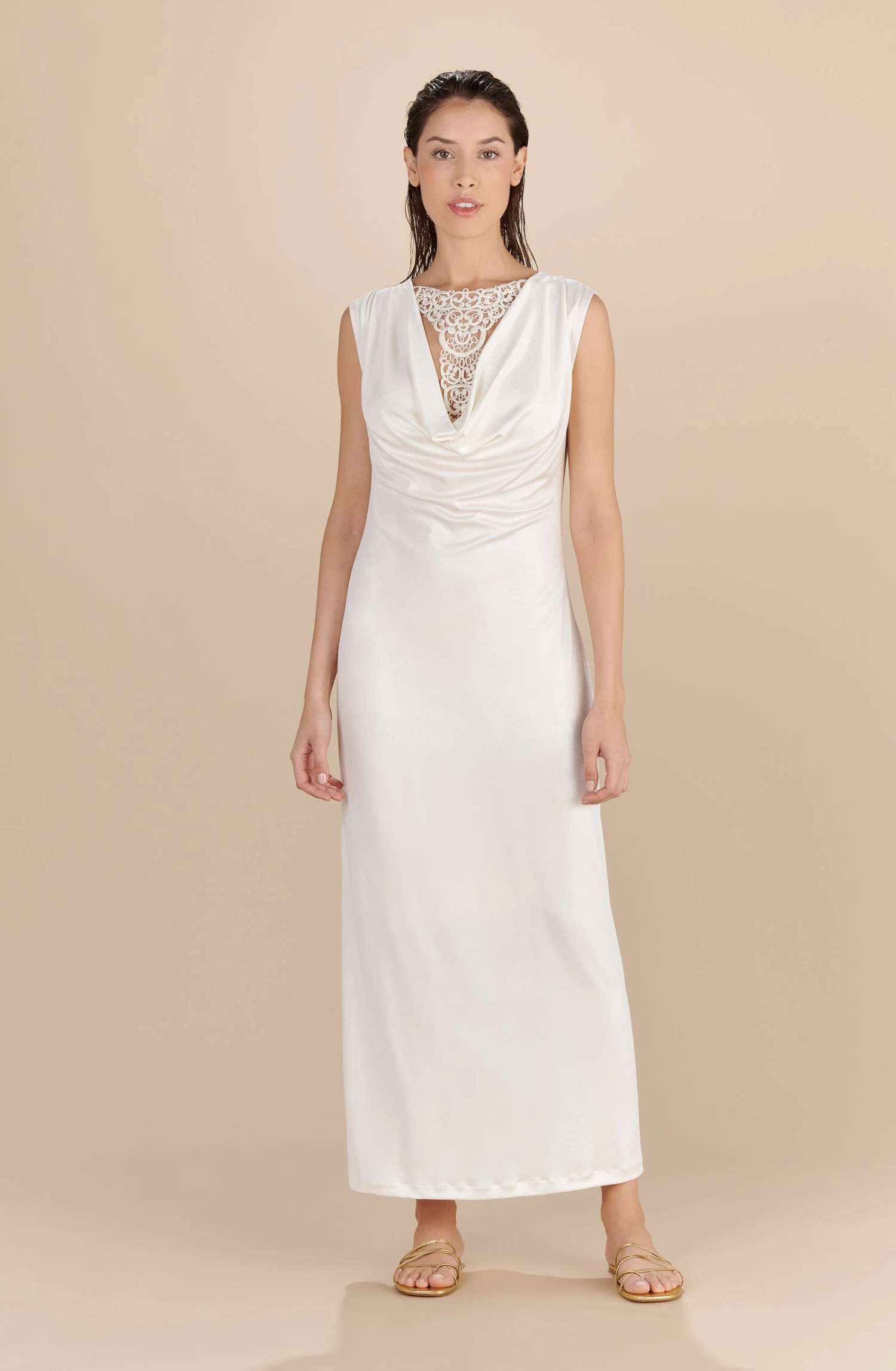 Robe longue sans manches, doublée de tulle chair, décolleté bénitier et guipure pouvant se porter devant ou au dos.