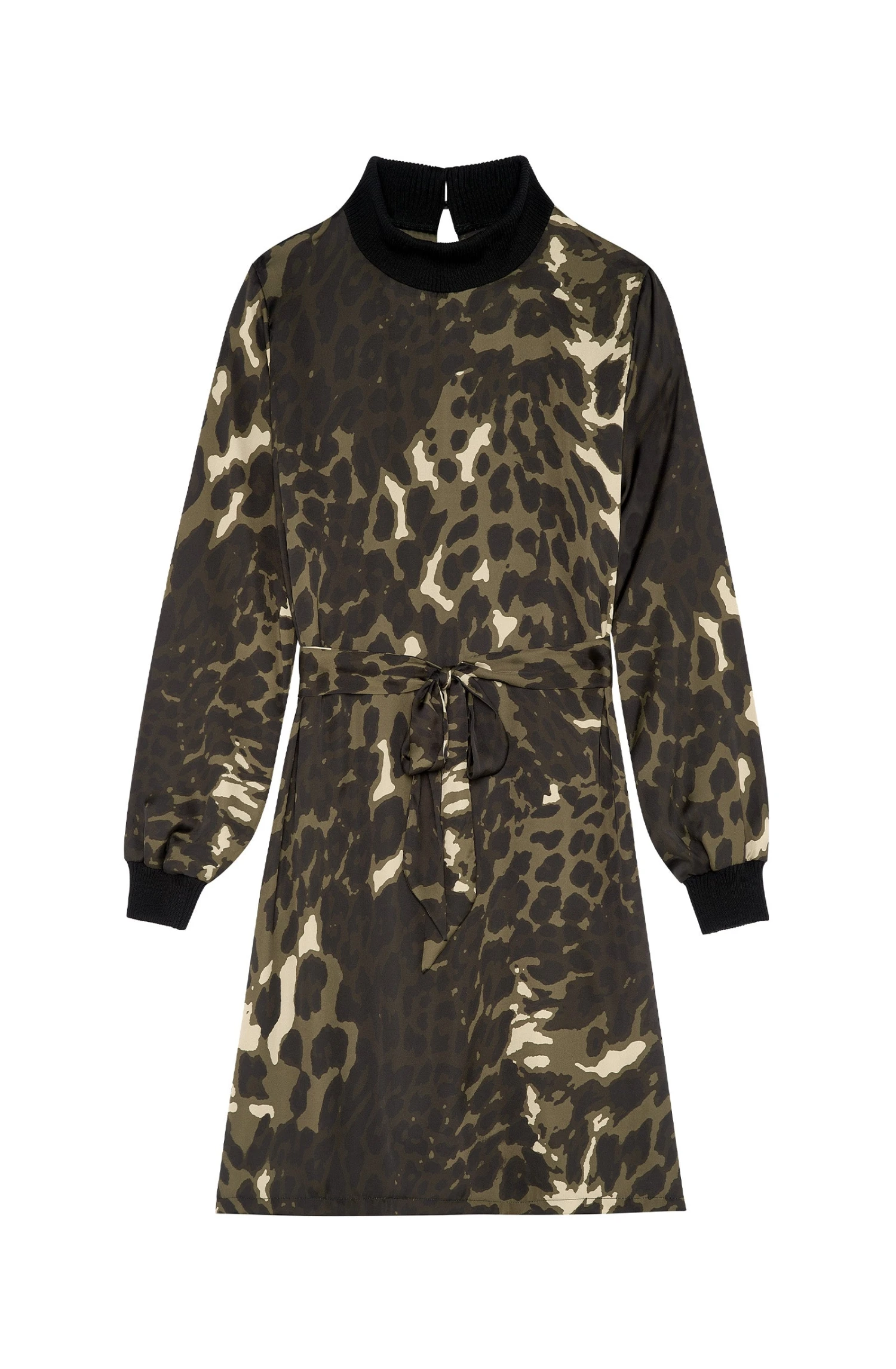 Contraste et mélange des matières, le satin fluide s’ourle de finitions en bord-côte au niveau du col et des poignets. La robe REBECCA joue des volumes avec style. Son imprimé JUNGLE se noue à la taille dans un esprit working-girl ou se porte en toute liberté.