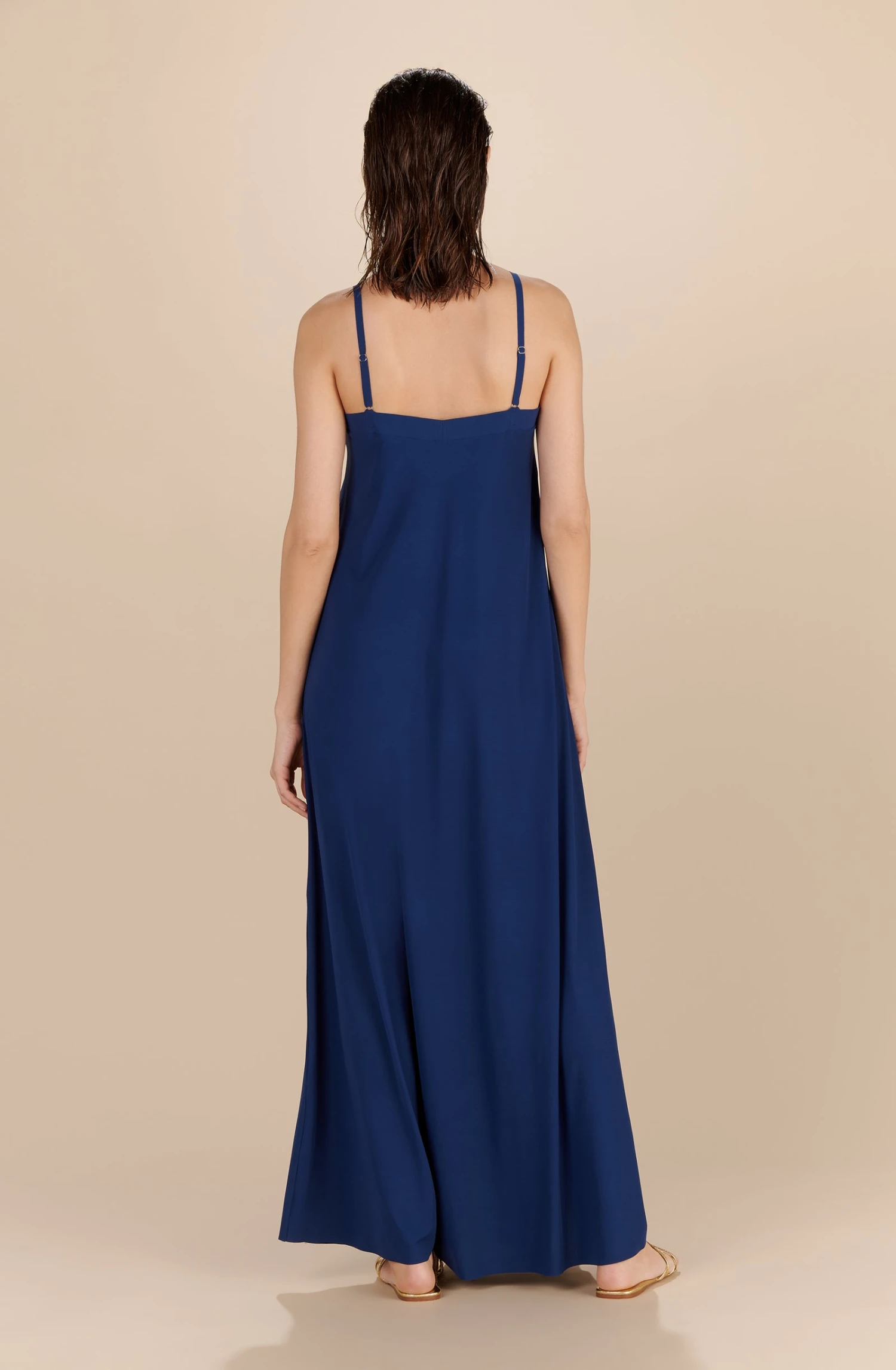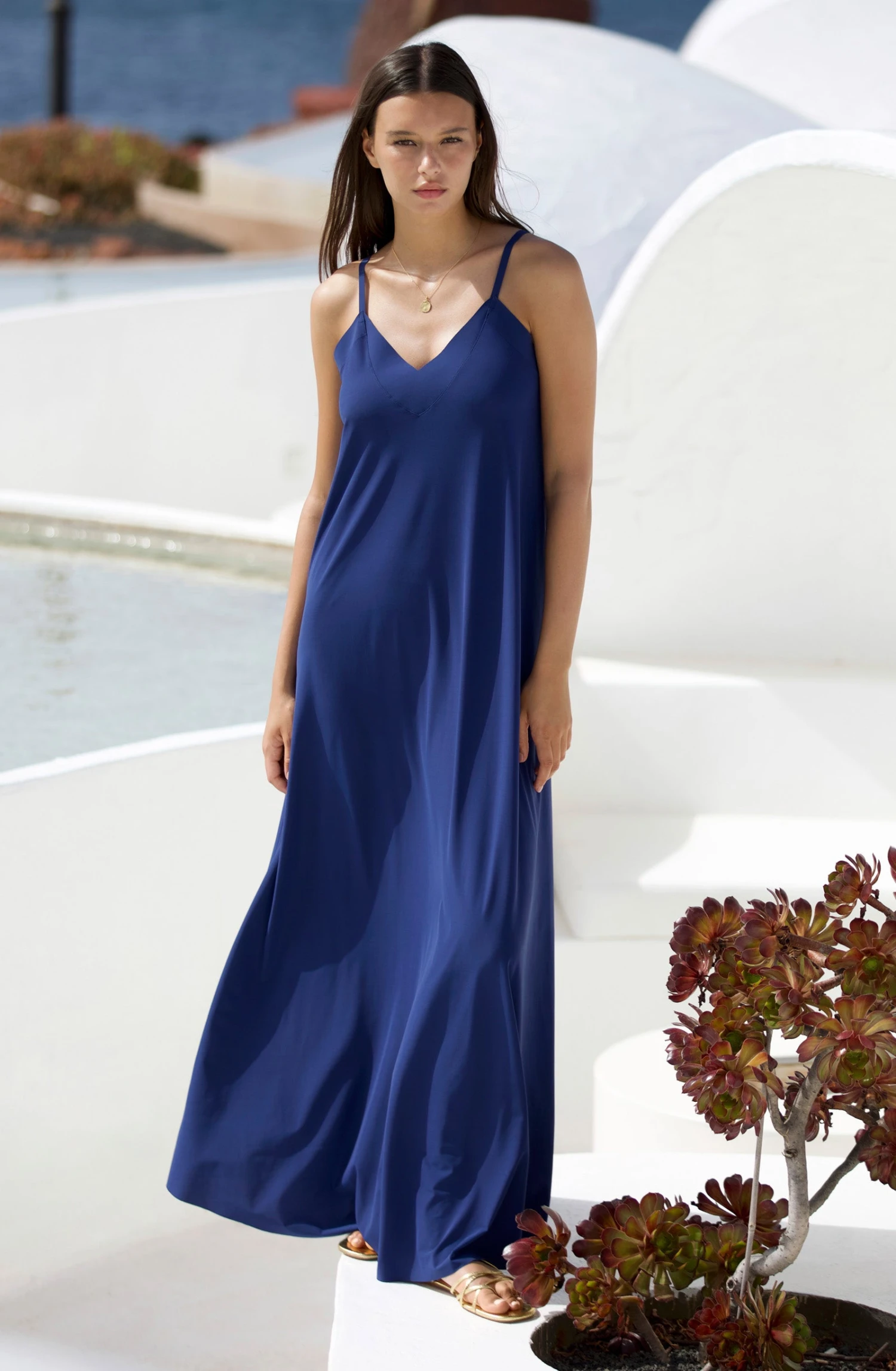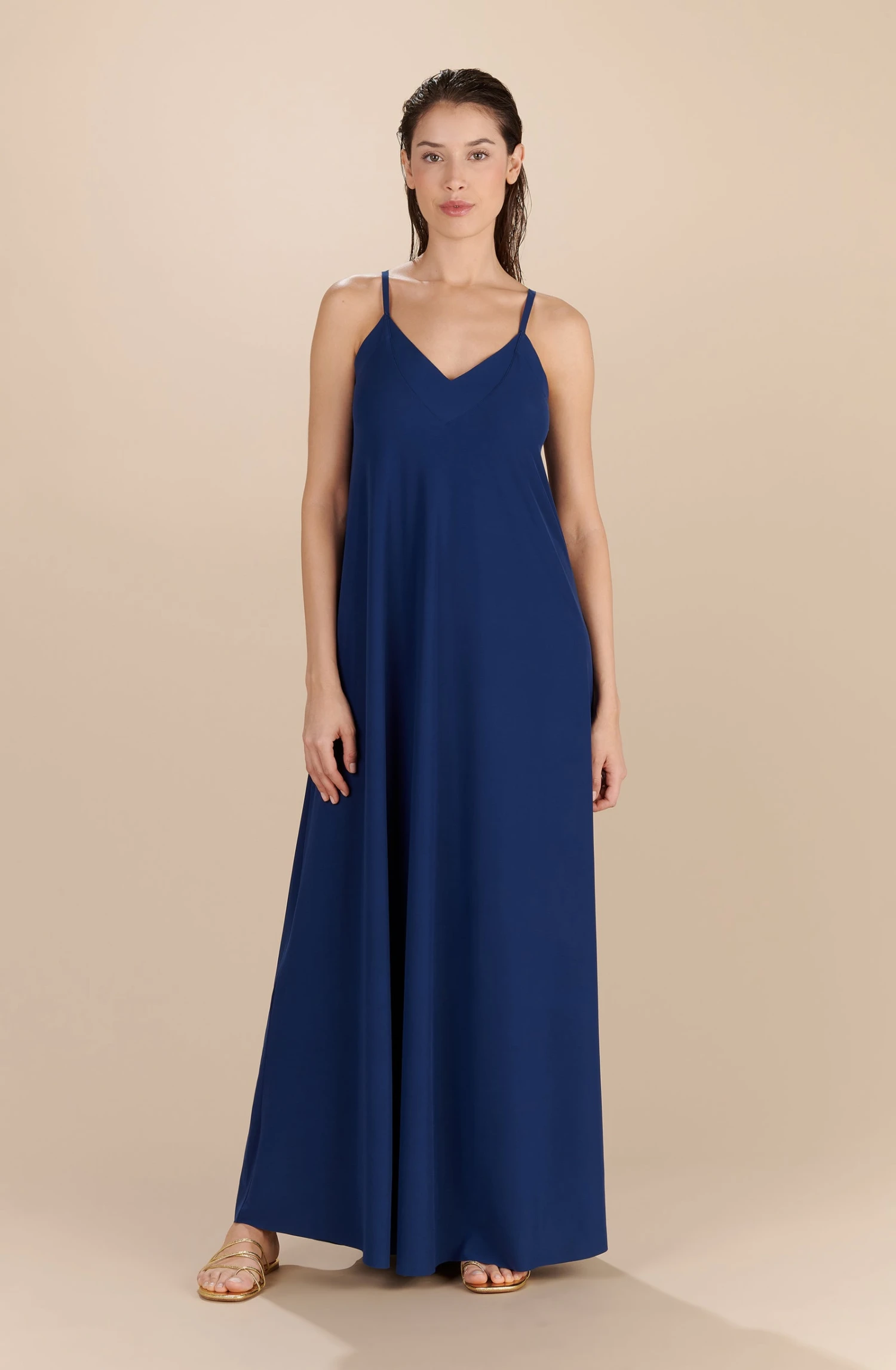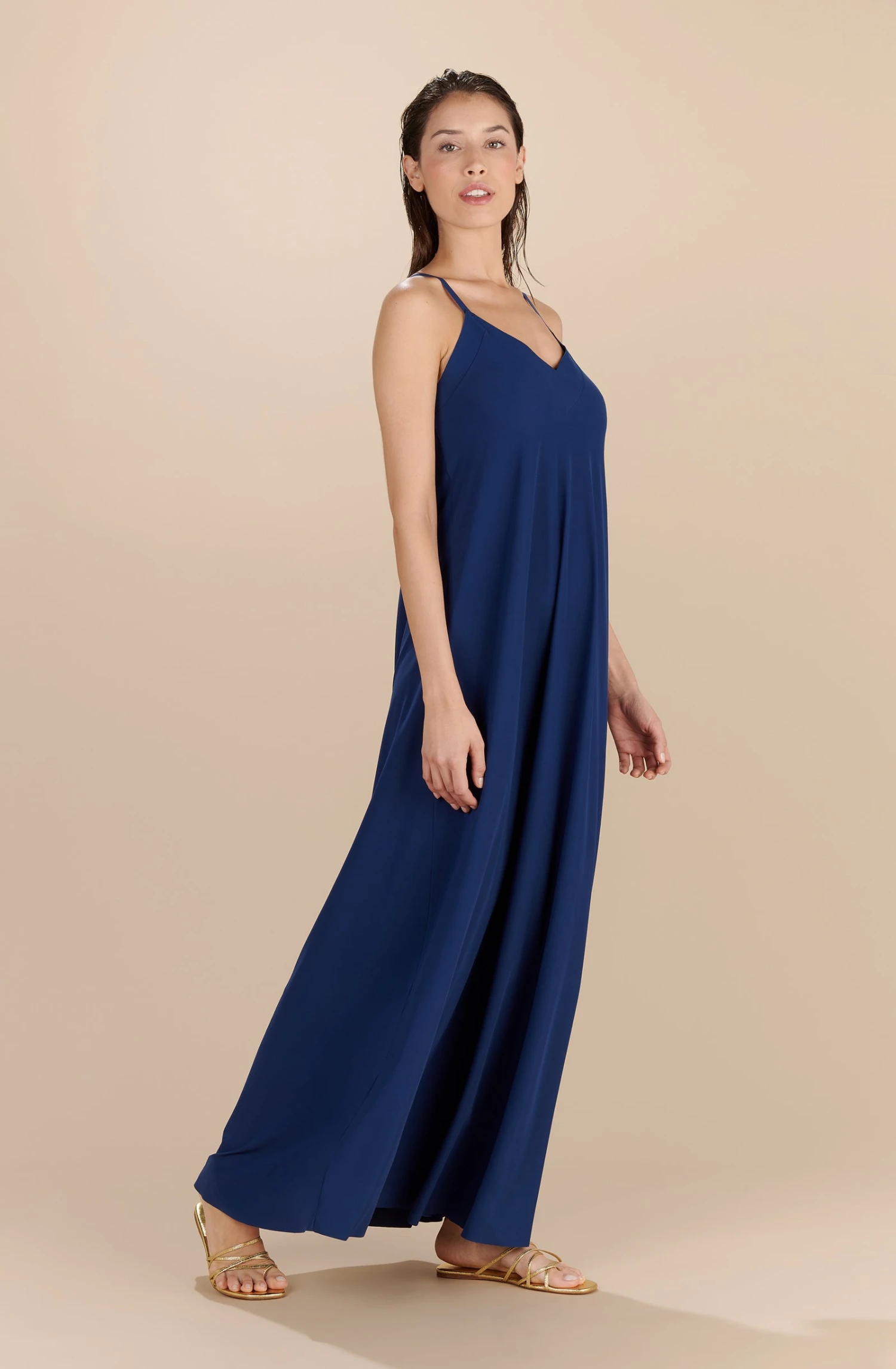 Robe longue, bretelles fines et réglables, décolleté en Bonded, finitions free cut.