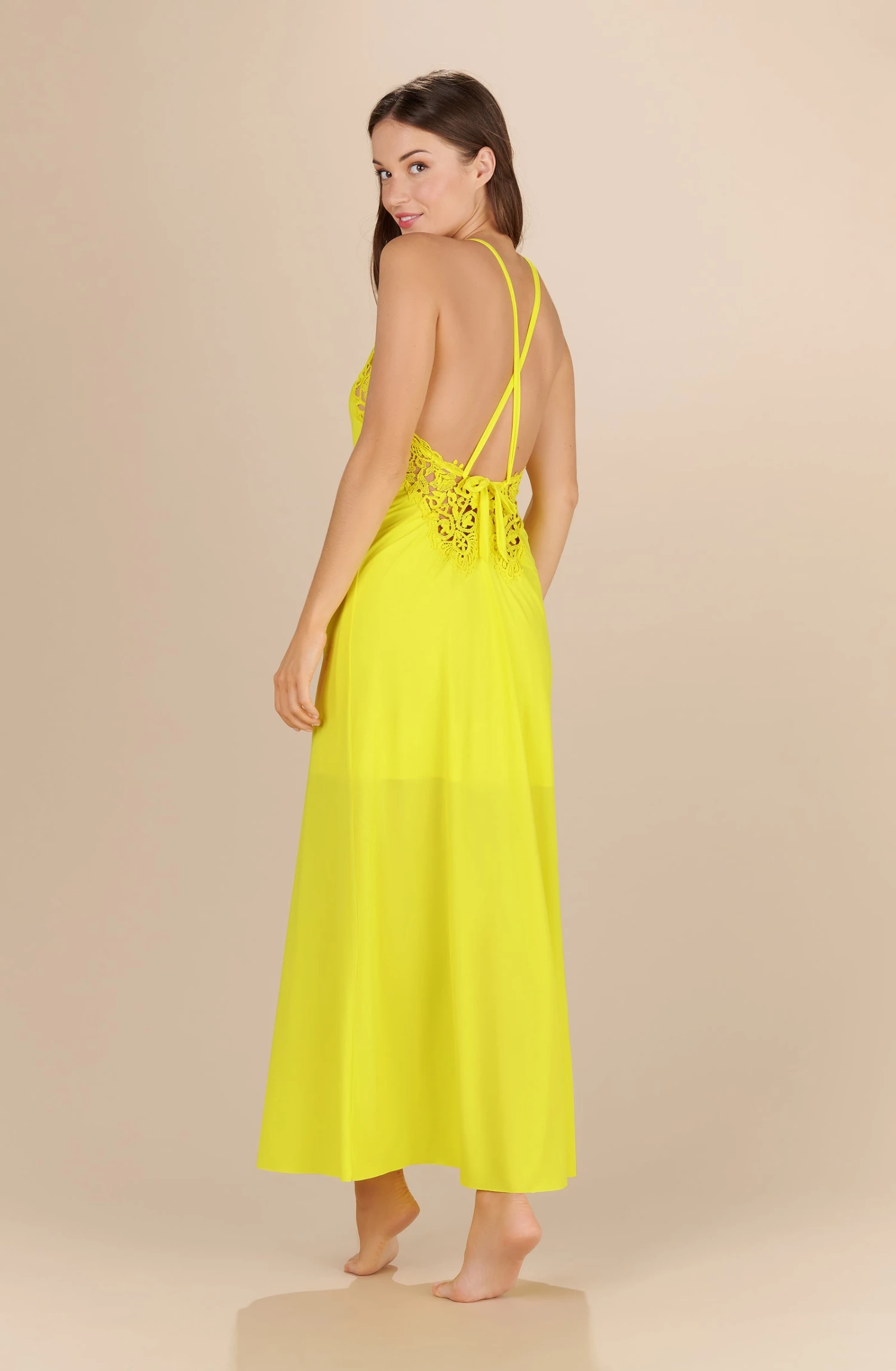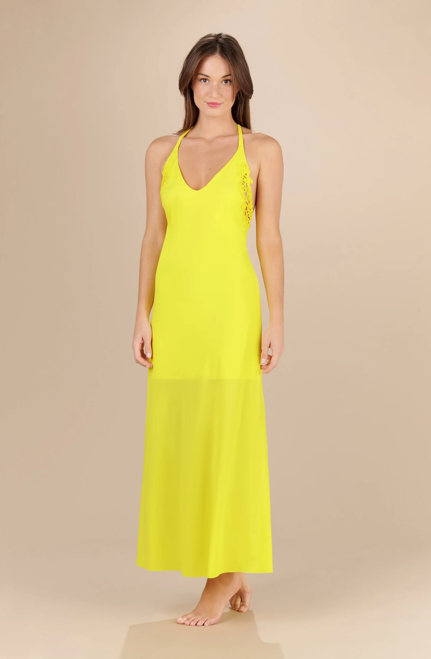 Total look féminin avec la robe longue ROWAN jaune. Discrètement nouée dans le cou ou croisée dans le dos, cette robe joue des contrastes avec chic. Son voile léger se pare d’une grande et délicate guipure dans le dos. Les découpes free cut lui donnent un air faussement décontracté. ROWAN épouse notre silhouette pour l’affiner avec élégance. Avec son charme haute couture, c’est la pièce à glisser sans hésitation dans sa valise cet été.