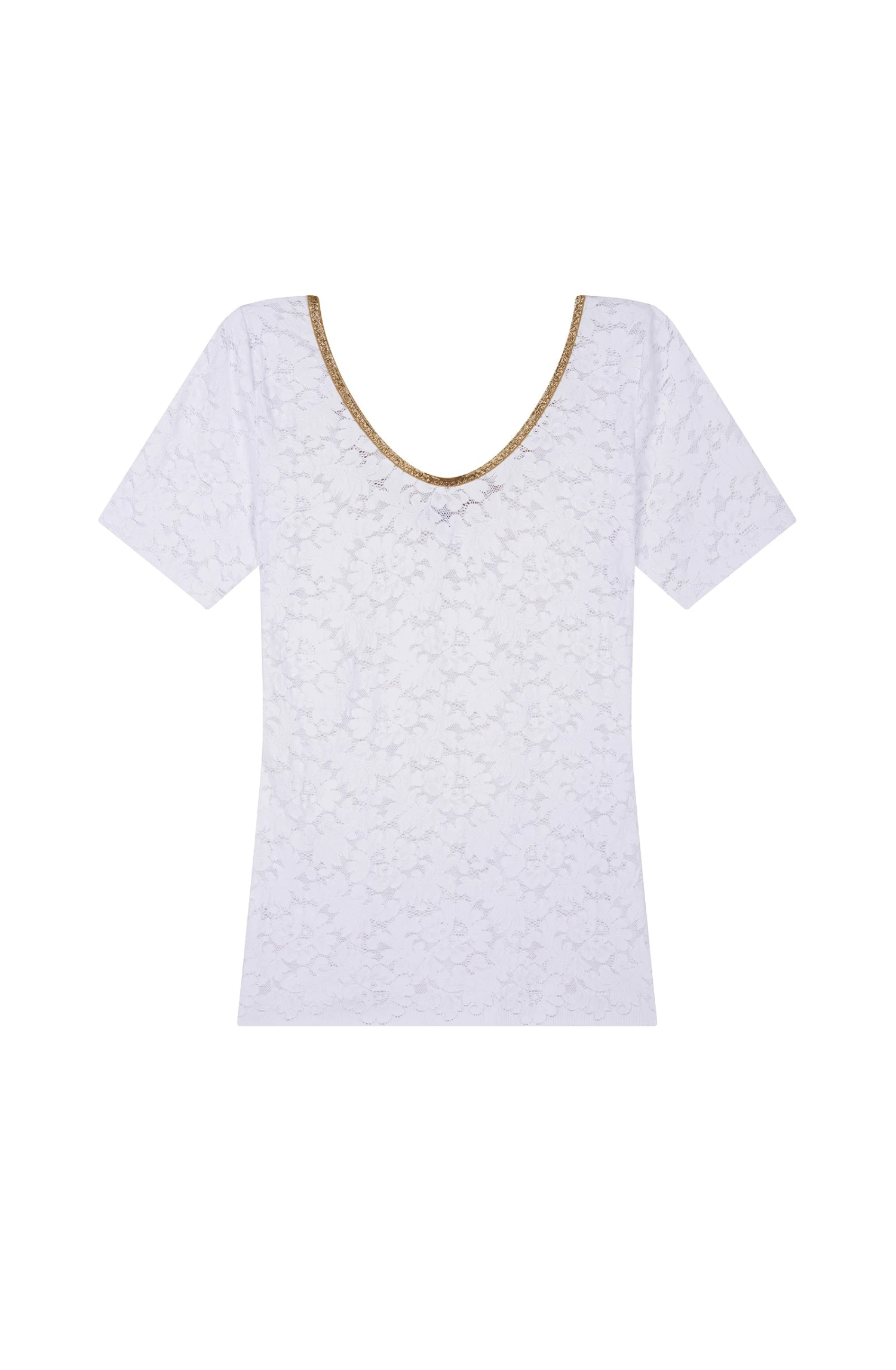 Top manches courtes. Décolleté rond devant et dos, finition en lurex doré. Dentelle française.