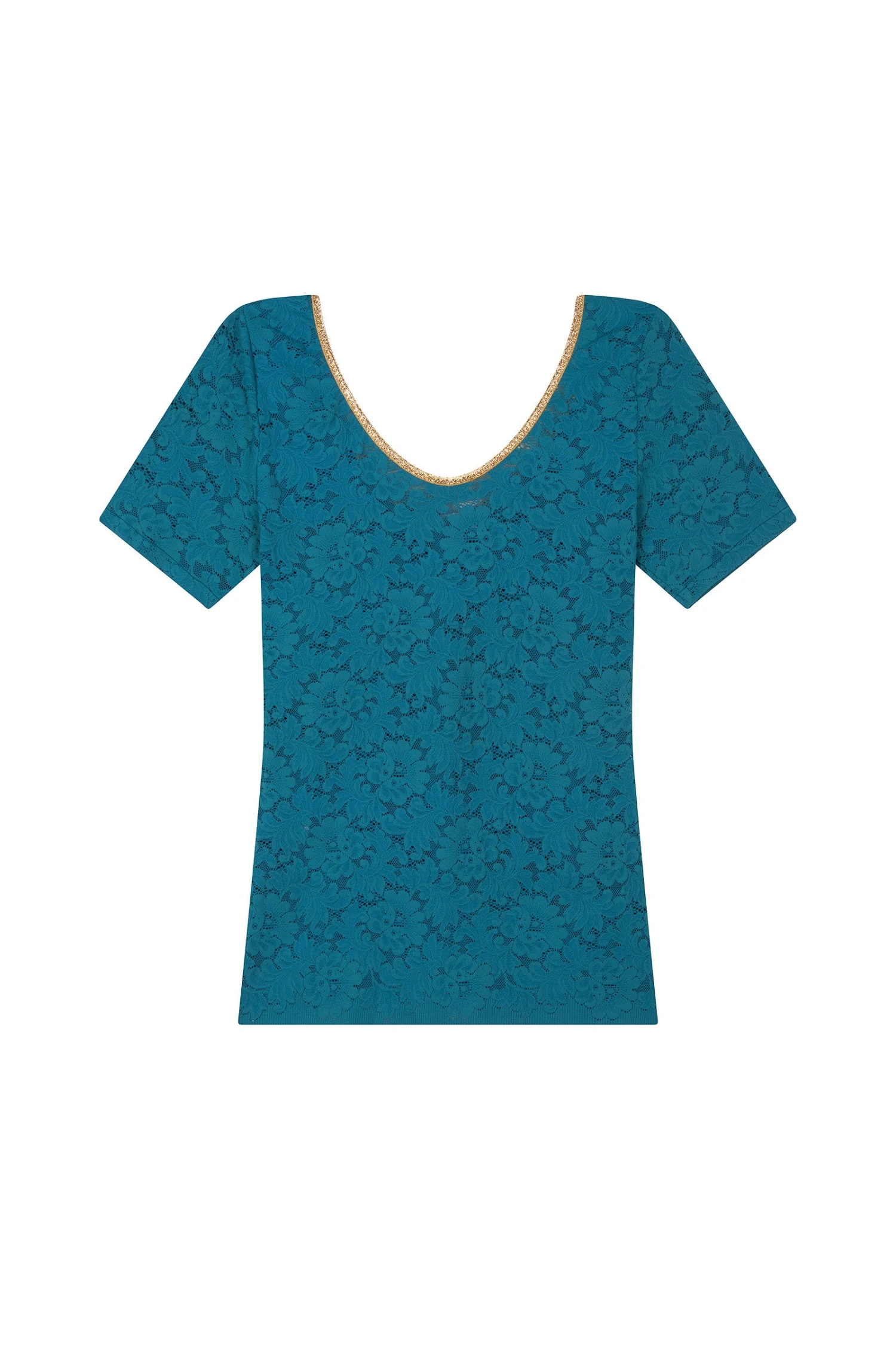 Top manches courtes. Décolleté rond devant et dos, finition en lurex doré. Dentelle française.